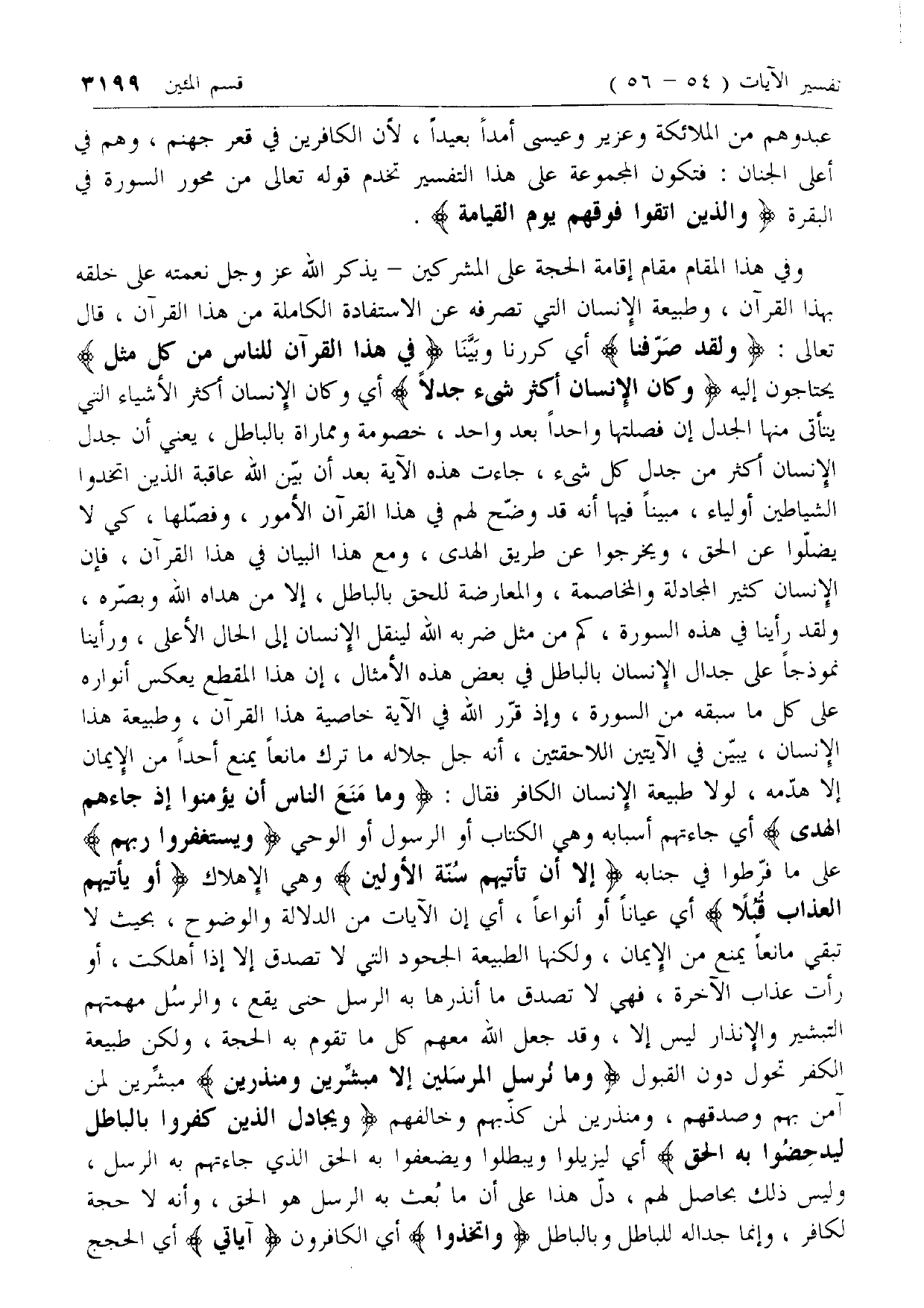 وَلَقَدْ صَرَّفْنا أي كررنا وبيّنا فِي هذَا الْقُرْآنِ لِلنَّاسِ مِنْ كُلِّ مَثَلٍ يحتاجون إليه وَكانَ الْإِنْسانُ أَكْثَرَ شَيْءٍ جَدَلًا أي وكان الإنسان أكثر الأشياء التي يتأتى منها الجدل إن فصلتها واحدا بعد واحد، خصومة ومماراة بالباطل، يعني أن جدل الإنسان أكثر من جدل كل شئ، جاءت هذه الآية بعد أن بيّن الله عاقبة الذين اتخذوا الشياطين أولياء، مبينا فيها أنه قد وضّح لهم في هذا القرآن الأمور، وفصّلها، كيلا يضلّوا عن الحق، ويخرجوا عن طريق الهدى، ومع هذا البيان في هذا القرآن، فإن الإنسان كثير المجادلة والمخاصمة، والمعارضة للحق بالباطل، إلا من هداه الله وبصّره، ولقد رأينا في هذه السورة، كم من مثل ضربه الله لينقل الإنسان إلى الحال الأعلى، ورأينا نموذجا على جدال الإنسان بالباطل في بعض هذه الأمثال، إن هذا المقطع يعكس أنواره على كل ما سبقه من السورة، وإذ قرّر الله في الآية خاصية هذا القرآن، وطبيعة هذا الإنسان، يبيّن في الآيتين اللاحقتين، أنه جل جلاله ما ترك مانعا يمنع أحدا من الإيمان إلا هدّمه، لولا طبيعة الإنسان الكافر فقال:
