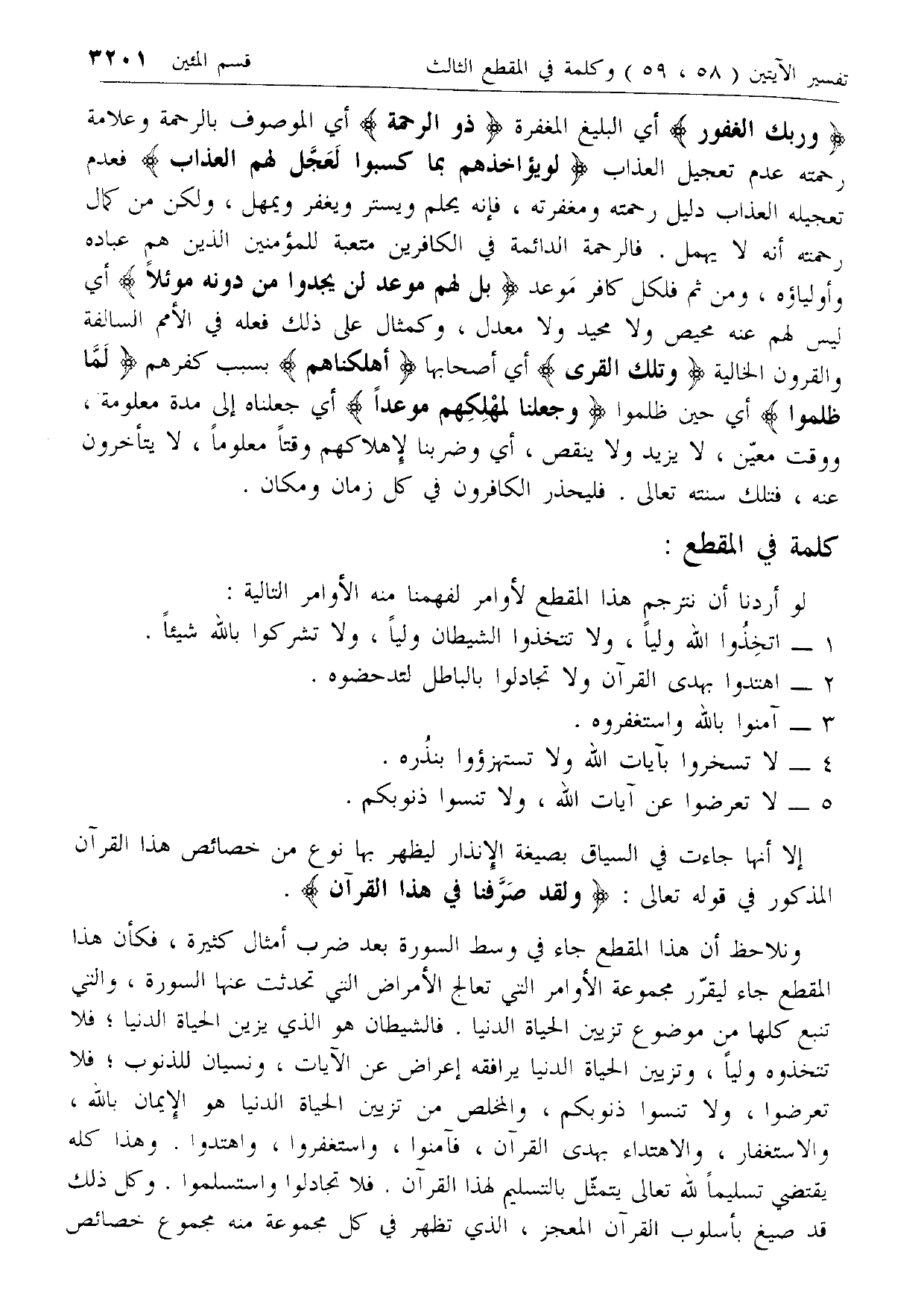 ونلاحظ أن هذا المقطع جاء في وسط السورة بعد ضرب أمثال كثيرة، فكأن هذا المقطع جاء ليقرّر مجموعة الأوامر التي تعالج الأمراض التي تحدثت عنها السورة، والتي تنبع كلها من موضوع تزيين الحياة الدنيا. فالشيطان هو الذي يزين الحياة الدنيا؛ فلا تتخذوه وليا، وتزيين الحياة الدنيا يرافقه إعراض عن الآيات، ونسيان للذنوب؛ فلا تعرضوا، ولا تنسوا ذنوبكم، والمخلص من تزيين الحياة الدنيا هو الإيمان بالله، والاستغفار، والاهتداء بهدى القرآن، فآمنوا، واستغفروا، واهتدوا. وهذا كله يقتضي تسليما لله تعالى يتمثّل بالتسليم لهذا القرآن. فلا تجادلوا واستسلموا. وكل ذلك قد صيغ بأسلوب القرآن المعجز، الذي تظهر في كل مجموعة منه مجموع خصائص