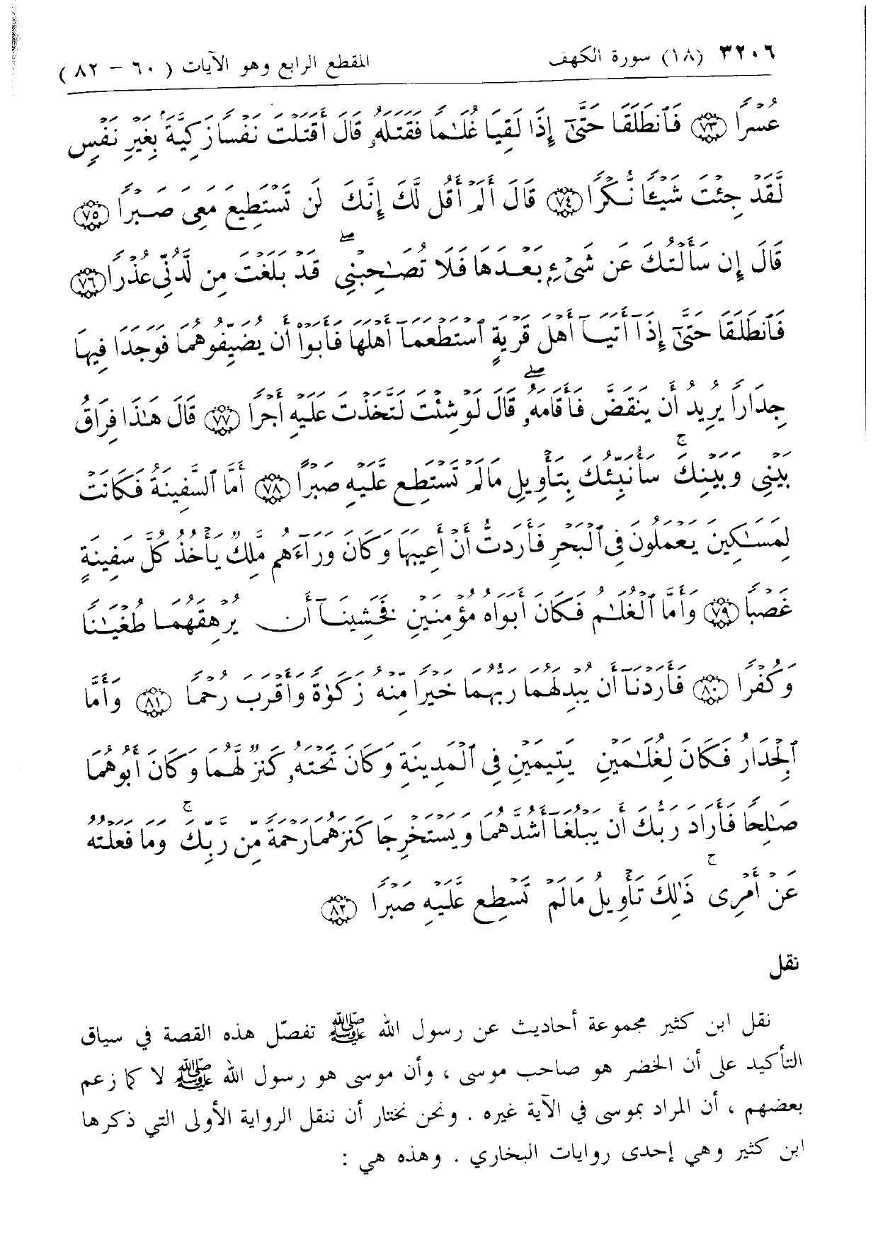 نقل ابن كثير مجموعة أحاديث عن رسول الله صلّى الله عليه وسلّم تفصّل هذه القصة في سياق التأكيد على أن الخضر هو صاحب موسى، وأن موسى هو رسول الله صلّى الله عليه وسلّم لا كما زعم بعضهم، أن المراد بموسى في الآية غيره. ونحن نختار أن ننقل الرواية الأولى التي ذكرها ابن كثير وهي إحدى روايات البخاري. وهذه هي: