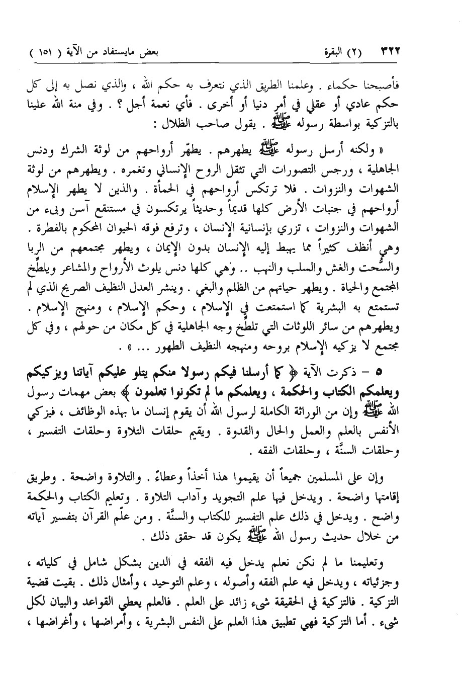 5 - ذكرت الآية كَما أَرْسَلْنا فِيكُمْ رَسُولًا مِنْكُمْ يَتْلُوا عَلَيْكُمْ آياتِنا وَيُزَكِّيكُمْ وَيُعَلِّمُكُمُ الْكِتابَ وَالْحِكْمَةَ، وَيُعَلِّمُكُمْ ما لَمْ تَكُونُوا تَعْلَمُونَ بعض مهمات رسول الله صلى الله عليه وسلم وإن من الوراثة الكاملة لرسول الله أن يقوم إنسان ما بهذه الوظائف، فيزكي الأنفس بالعلم والعمل والحال والقدوة. ويقيم حلقات التلاوة وحلقات التفسير، وحلقات السنة، وحلقات الفقه.