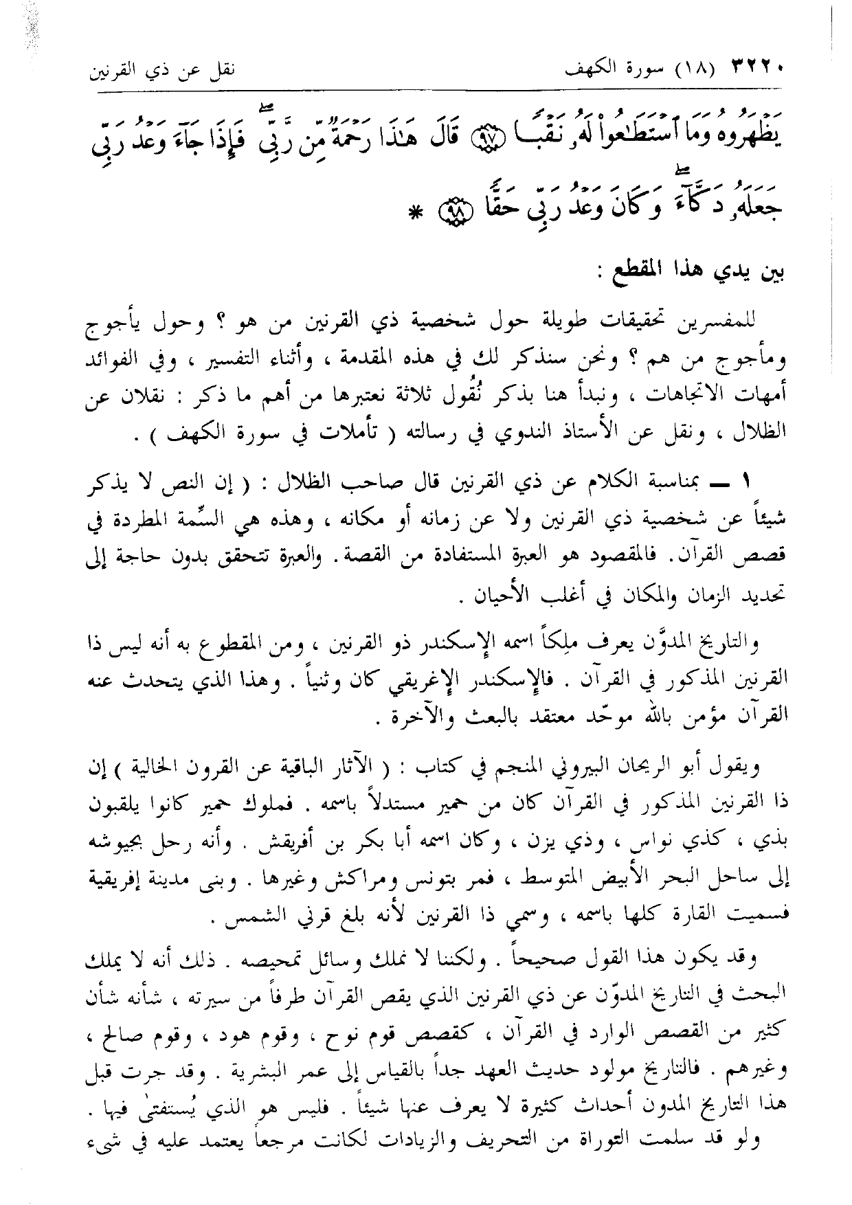للمفسرين تحقيقات طويلة حول شخصية ذي القرنين من هو؟ وحول يأجوج ومأجوج من هم؟ ونحن سنذكر لك في هذه المقدمة، وأثناء التفسير، وفي الفوائد أمهات الاتجاهات، ونبدأ هنا بذكر نقول ثلاثة نعتبرها من أهم ما ذكر: نقلان عن الظلال، ونقل عن الأستاذ الندوي في رسالته (تأملات في سورة الكهف).