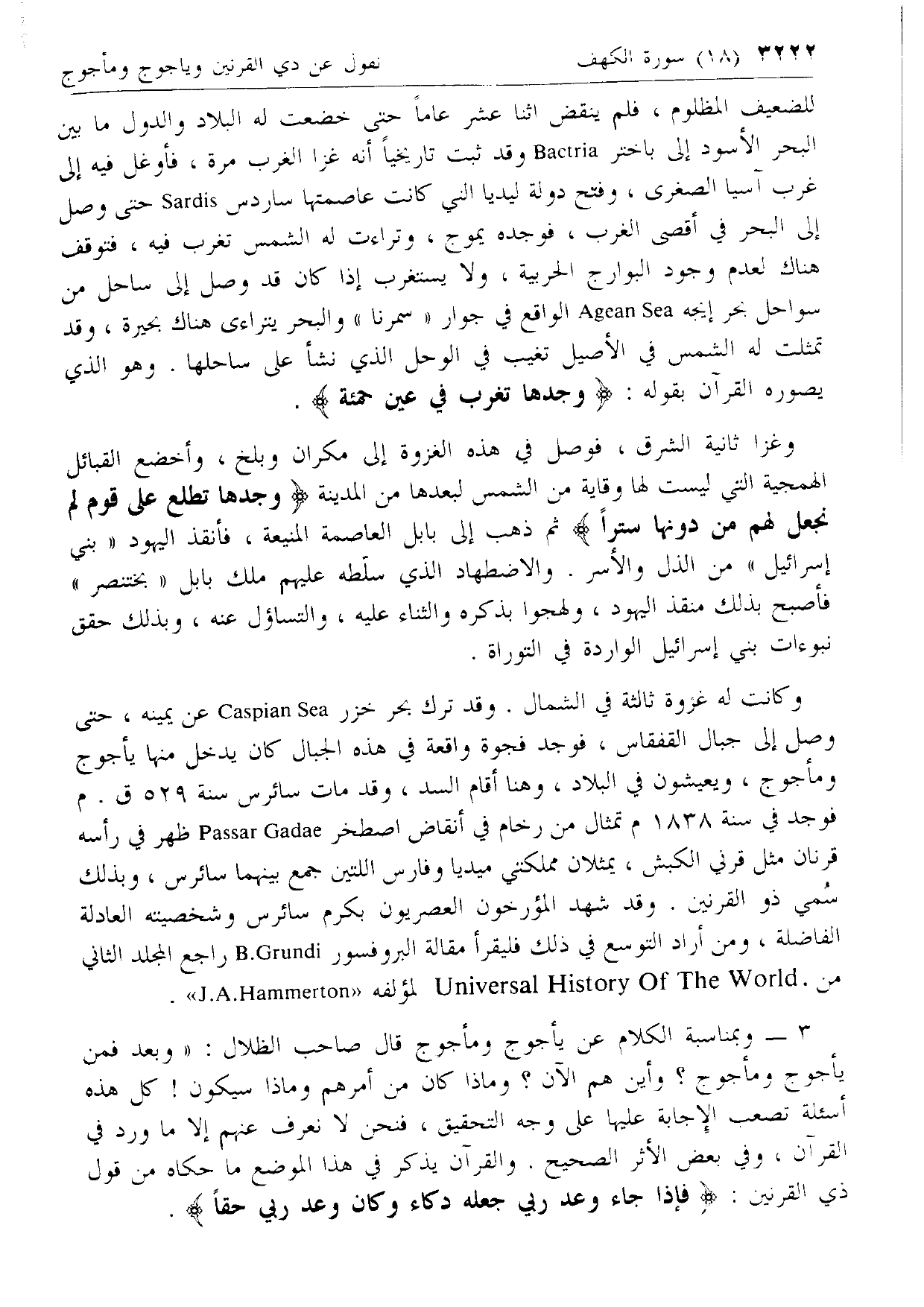 للضعيف المظلوم، فلم ينقض اثنا عشر عاما حتى خضعت له البلاد والدول ما بين البحر الأسود إلى باختر Bactria وقد ثبت تاريخيا أنه غزا الغرب مرة، فأوغل فيه إلى غرب آسيا الصغرى، وفتح دولة ليديا التي كانت عاصمتها ساردس Sardis حتى وصل إلى البحر في أقصى الغرب، فوجده يموج، وتراءت له الشمس تغرب فيه، فتوقف هناك لعدم وجود البوارج الحربية، ولا يستغرب إذا كان قد وصل إلى ساحل من سواحل بحر إيجه Agean Sea الواقع في جوار «سمرنا» والبحر يتراءى هناك بحيرة، وقد تمثلت له الشمس في الأصيل تغيب في الوحل الذي نشأ على ساحلها. وهو الذي يصوره القرآن بقوله: وَجَدَها تَغْرُبُ فِي عَيْنٍ حَمِئَةٍ.