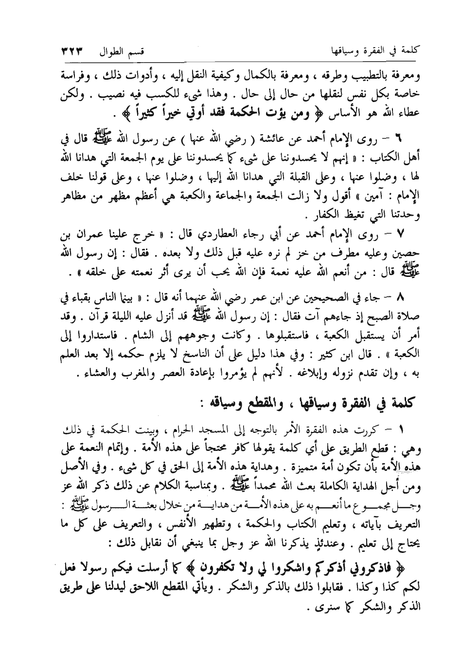 1 - كررت هذه الفقرة الأمر بالتوجه إلى المسجد الحرام، وبينت الحكمة في ذلك وهي: قطع الطريق على أي كلمة يقولها كافر محتجا على هذه الأمة. وإتمام النعمة على هذه الأمة بأن تكون أمة متميزة. وهداية هذه الأمة إلى الحق في كل شئ. وفي الأصل ومن أجل الهداية الكاملة بعث الله محمدا صلى الله عليه وسلم. وبمناسبة الكلام عن ذلك ذكر الله عزّ وجل مجموع ما أنعم به على هذه الأمة من هداية من خلال بعثة الرسول صلى الله عليه وسلم: