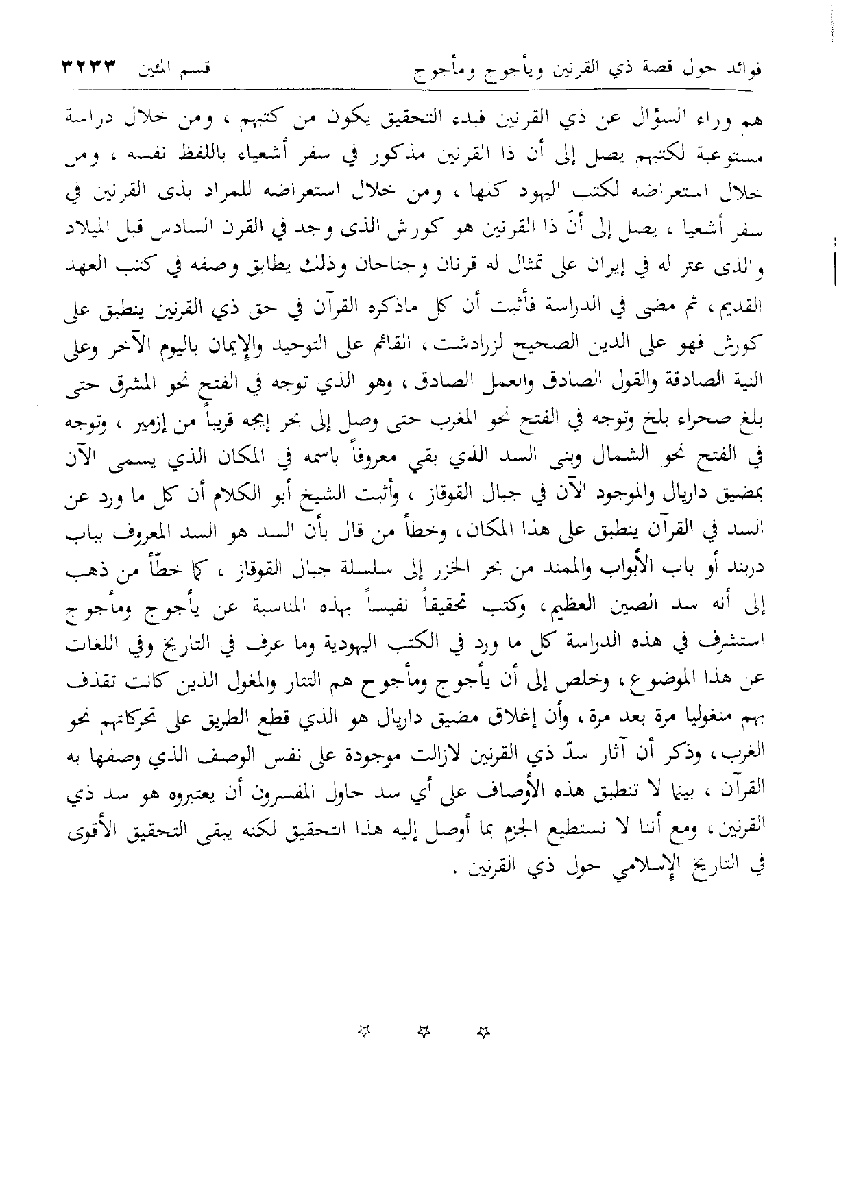 هم وراء السؤال عن ذي القرنين فبدأ التحقيق يكون من كتبهم، ومن خلال دراسة مستوعبة لكتبهم يصل إلى أن ذا القرنين مذكور في سفر أشعياء باللفظ نفسه، ومن خلال استعراضه لكتب اليهود كلها، ومن خلال استعراضه للمراد بذى القرنين في سفر أشعيا، يصل إلى أنّ ذا القرنين هو كورش الذى وجد في القرن السادس قبل الميلاد والذى عثر له في إيران على تمثال له قرنان وجناحان وذلك يطابق وصفه في كتب العهد القديم، ثم مضى في الدراسة فأثبت أن كل ما ذكره القرآن في حق ذي القرنين ينطبق على كورش فهو على الدين الصحيح لزرادشت، القائم على التوحيد والإيمان باليوم الآخر وعلى النية الصادقة والقول الصادق والعمل الصادق، وهو الذي توجه في الفتح نحو المشرق حتى بلغ صحراء بلخ وتوجه في الفتح نحو المغرب حتى وصل إلى بحر إيجه قريبا من إزمير، وتوجه في الفتح نحو الشمال وبنى السد الذي بقي معروفا باسمه في المكان الذي يسمى الآن بمضيق داريال والموجود الآن في جبال القوقاز، وأثبت الشيخ أبو الكلام أن كل ما ورد عن السد في القرآن ينطبق على هذا المكان، وخطأ من قال بأن السد هو السد المعروف بباب دربند أو باب الأبواب والممتد من بحر الخزر إلى سلسلة جبال القوقاز، كما خطّأ من ذهب إلى أنه سد الصين العظيم، وكتب تحقيقا نفيسا بهذه المناسبة عن يأجوج ومأجوج استشرف في هذه الدراسة كل ما ورد في الكتب اليهودية وما عرف في التاريخ وفي اللغات عن هذا الموضوع، وخلص إلى أن يأجوج ومأجوج هم التتار والمغول الذين كانت تقذف بهم منغوليا مرة بعد مرة، وأن إغلاق مضيق داريال هو الذي قطع الطريق على تحركاتهم نحو الغرب، وذكر أن آثار سدّ ذي القرنين لا زالت موجودة على نفس الوصف الذي وصفها به القرآن، بينما لا تنطبق هذه الأوصاف على أي سد حاول المفسرون أن يعتبروه هو سد ذي القرنين، ومع أننا لا نستطيع الجزم بما أوصل إليه هذا التحقيق لكنه يبقى التحقيق الأقوى في التاريخ الإسلامي حول ذي القرنين.