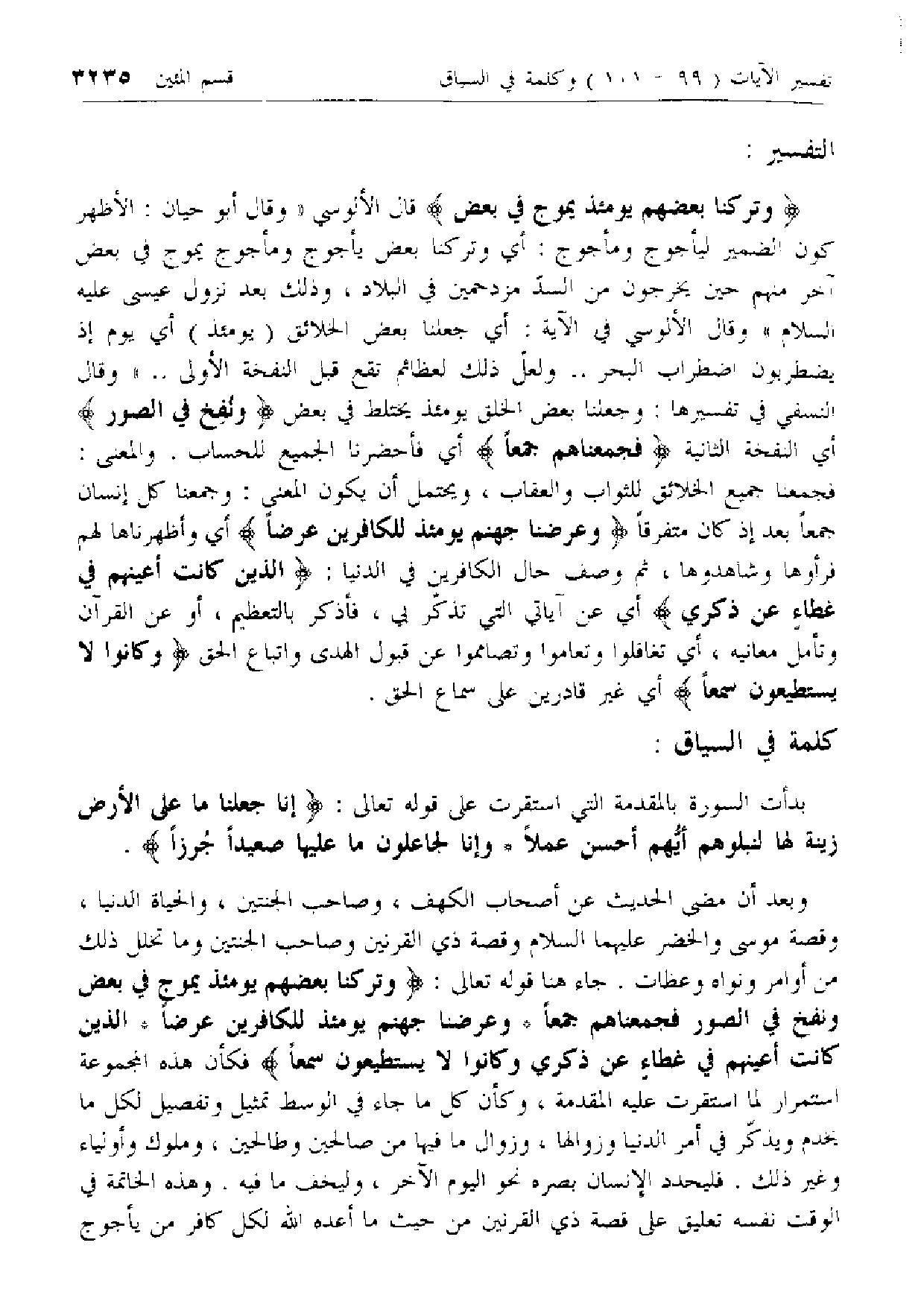 وبعد أن مضى الحديث عن أصحاب الكهف، وصاحب الجنتين، والحياة الدنيا، وقصة موسى والخضر عليهما السلام وقصة ذي القرنين وصاحب الجنتين وما تخلل ذلك من أوامر ونواه وعظات. جاء هنا قوله تعالى: وَتَرَكْنا بَعْضَهُمْ يَوْمَئِذٍ يَمُوجُ فِي بَعْضٍ وَنُفِخَ فِي الصُّورِ فَجَمَعْناهُمْ جَمْعاً* وَعَرَضْنا جَهَنَّمَ يَوْمَئِذٍ لِلْكافِرِينَ عَرْضاً* الَّذِينَ كانَتْ أَعْيُنُهُمْ فِي غِطاءٍ عَنْ ذِكْرِي وَكانُوا لا يَسْتَطِيعُونَ سَمْعاً فكأن هذه المجموعة استمرار لما استقرت عليه المقدمة، وكأن كل ما جاء في الوسط تمثيل وتفصيل لكل ما يخدم ويذكّر في أمر الدنيا وزوالها، وزوال ما فيها من صالحين وطالحين، وملوك وأولياء وغير ذلك. فليحدد الإنسان بصره نحو اليوم الآخر، وليخف ما فيه. وهذه الخاتمة في الوقت نفسه تعليق على قصة ذي القرنين من حيث ما أعده الله لكل كافر من يأجوج