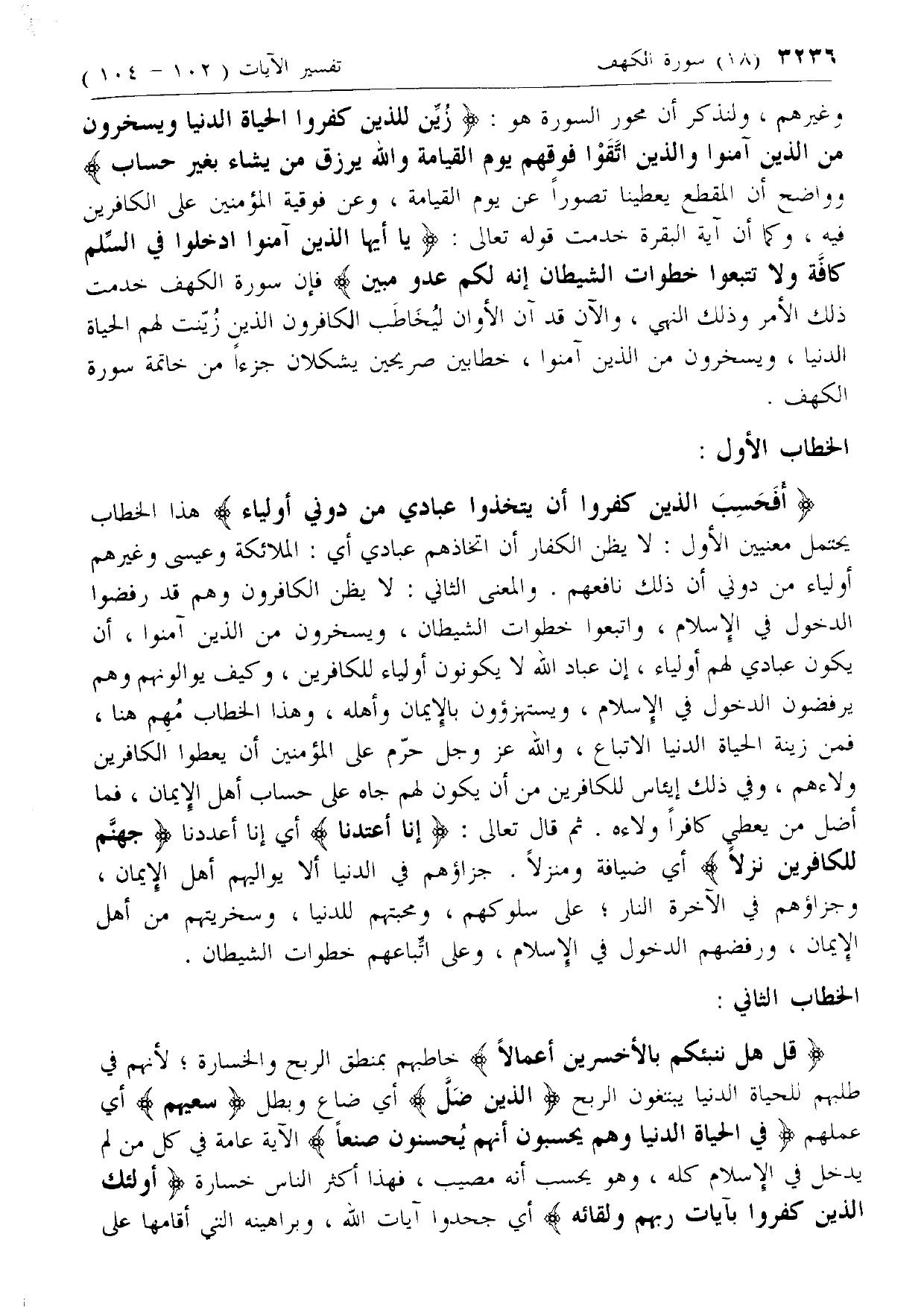 وغيرهم، ولنذكر أن محور السورة هو: زُيِّنَ لِلَّذِينَ كَفَرُوا الْحَياةُ الدُّنْيا وَيَسْخَرُونَ مِنَ الَّذِينَ آمَنُوا وَالَّذِينَ اتَّقَوْا فَوْقَهُمْ يَوْمَ الْقِيامَةِ وَاللَّهُ يَرْزُقُ مَنْ يَشاءُ بِغَيْرِ حِسابٍ وواضح أن المقطع يعطينا تصورا عن يوم القيامة، وعن فوقية المؤمنين على الكافرين فيه، وكما أن آية البقرة خدمت قوله تعالى: يا أَيُّهَا الَّذِينَ آمَنُوا ادْخُلُوا فِي السِّلْمِ كَافَّةً وَلا تَتَّبِعُوا خُطُواتِ الشَّيْطانِ إِنَّهُ لَكُمْ عَدُوٌّ مُبِينٌ فإن سورة الكهف خدمت ذلك الأمر وذلك النهي، والآن قد آن الأوان ليخاطب الكافرون الذين زيّنت لهم الحياة الدنيا، ويسخرون من الذين آمنوا، خطابين صريحين يشكلان جزءا من خاتمة سورة الكهف.