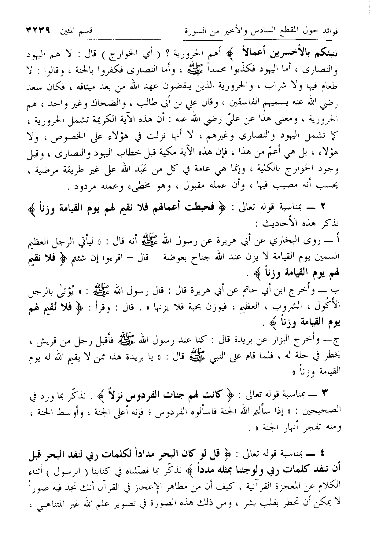 نُنَبِّئُكُمْ بِالْأَخْسَرِينَ أَعْمالًا أهم الحرورية؟ (أي الخوارج) قال: لا هم اليهود والنصارى، أما اليهود فكذّبوا محمدا صلّى الله عليه وسلّم، وأما النصارى فكفروا بالجنة، وقالوا: لا طعام فيها ولا شراب، والحرورية الذين ينقضون عهد الله من بعد ميثاقه، فكان سعد رضي الله عنه يسميهم الفاسقين، وقال علي بن أبي طالب، والضحاك وغير واحد، هم الحرورية، ومعنى هذا عن عليّ رضي الله عنه: أن هذه الآية الكريمة تشمل الحرورية، كما تشمل اليهود والنصارى وغيرهم، لا أنها نزلت في هؤلاء على الخصوص، ولا هؤلاء، بل هي أعمّ من هذا، فإن هذه الآية مكية قبل خطاب اليهود والنصارى، وقبل وجود الخوارج بالكلية، وإنما هي عامة في كل من عبد الله على غير طريقة مرضية، يحسب أنه مصيب فيها، وأن عمله مقبول، وهو مخطئ وعمله مردود.