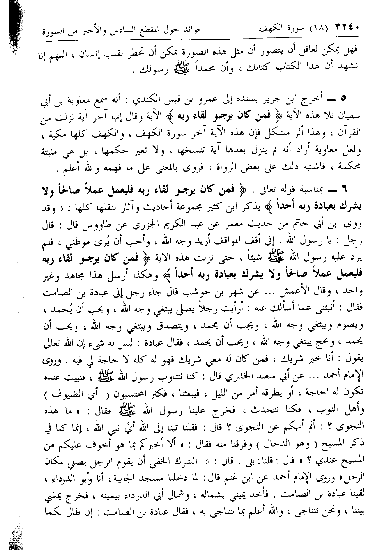 بمناسبة قوله تعالى: فَمَنْ كانَ يَرْجُوا لِقاءَ رَبِّهِ فَلْيَعْمَلْ عَمَلًا صالِحاً وَلا يُشْرِكْ بِعِبادَةِ رَبِّهِ أَحَداً يذكر ابن كثير مجموعة أحاديث وآثار ننقلها كلها: «وقد روى ابن أبي حاتم من حديث معمر عن عبد الكريم الجزري عن طاوس قال: قال رجل: يا رسول الله: إني أقف المواقف أريد وجه الله، وأحب أن يرى موطني، فلم يرد عليه رسول الله صلّى الله عليه وسلّم شيئا، حتى نزلت هذه الآية فَمَنْ كانَ يَرْجُوا لِقاءَ رَبِّهِ فَلْيَعْمَلْ عَمَلًا صالِحاً وَلا يُشْرِكْ بِعِبادَةِ رَبِّهِ أَحَداً وهكذا أرسل هذا مجاهد وغير واحد، وقال الأعمش ... عن شهر بن حوشب قال جاء رجل إلى عبادة بن الصامت فقال: أنبئني عما أسألك عنه: أرأيت رجلا يصلي يبتغي وجه الله، ويحب أن يحمد، ويصوم ويبتغي وجه الله، ويجب أن يحمد، ويتصدق ويبتغي وجه الله، ويحب أن يحمد، ويحج يبتغي وجه الله، ويحب أن يحمد، فقال عبادة: ليس له شئ إن الله تعالى يقول: أنا خير شريك، فمن كان له معي شريك فهو له كله لا حاجة لي فيه. وروى الإمام أحمد ... عن أبي سعيد الخدري قال: كنا نتناوب رسول الله صلّى الله عليه وسلّم، فنبيت عنده تكون له الحاجة، أو يطرقه أمر من الليل، فيبعثنا، فكثر المحتسبون (أي الضيوف) وأهل النوب، فكنا نتحدث، فخرج علينا رسول الله صلّى الله عليه وسلّم فقال: «ما هذه النجوى؟» ألم أنهكم عن النجوى؟ قال: فقلنا تبنا إلى الله أي نبي الله، إنما كنا في ذكر المسيح (وهو الدجال) وفرقنا منه فقال: «ألا أخبركم بما هو أخوف عليكم من المسيح عندي؟» قال: قلنا: بلى. قال: «الشرك الخفي أن يقوم الرجل يصلي لمكان الرجل» وروى الإمام أحمد عن ابن غنم قال: لما دخلنا مسجد الجابية، أنا وأبو الدرداء، لقينا عبادة بن الصامت، فأخذ يميني بشماله، وشمال أبي الدرداء بيمينه، فخرج يمشي بيننا، ونحن نتناجى، والله أعلم بما نتناجى به، فقال عبادة بن الصامت: إن طال بكما