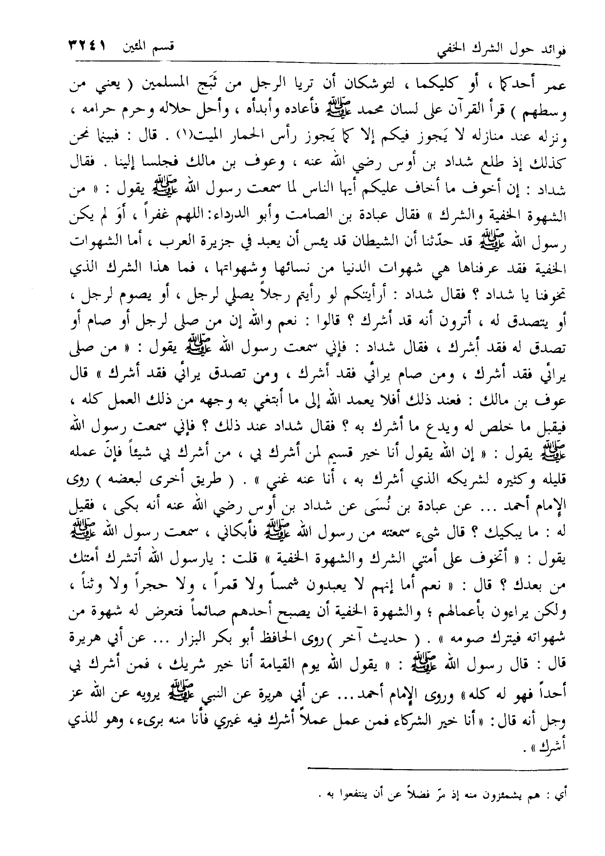 عمر أحدكما، أو كليكما، لتوشكان أن تريا الرجل من ثبج المسلمين (يعني من وسطهم) قرأ القرآن على لسان محمد صلّى الله عليه وسلّم فأعاده وأبدأه، وأحل حلاله وحرم حرامه، ونزله عند منازله لا يجوز فيكم إلا كما يجوز رأس الحمار الميت (¬1). قال: فبينما نحن كذلك إذ طلع شداد بن أوس رضي الله عنه، وعوف بن مالك فجلسا إلينا. فقال شداد: إن أخوف ما أخاف عليكم أيها الناس لما سمعت رسول الله صلّى الله عليه وسلّم يقول: «من الشهوة الخفية والشرك» فقال عبادة بن الصامت وأبو الدرداء: اللهم غفرا، أو لم يكن رسول الله صلّى الله عليه وسلّم قد حدّثنا أن الشيطان قد يئس أن يعبد في جزيرة العرب، أما الشهوات الخفية فقد عرفناها هي شهوات الدنيا من نسائها وشهواتها، فما هذا الشرك الذي تخوفنا يا شداد؟ فقال شداد: أرأيتكم لو رأيتم رجلا يصلي لرجل، أو يصوم لرجل، أو يتصدق له، أترون أنه قد أشرك؟ قالوا: نعم والله إن من صلى لرجل أو صام أو تصدق له فقد أشرك، فقال شداد: فإني سمعت رسول الله صلّى الله عليه وسلّم يقول: «من صلى يرائي فقد أشرك، ومن صام يرائي فقد أشرك، ومن تصدق يرائي فقد أشرك» قال عوف بن مالك: فعند ذلك أفلا يعمد الله إلى ما أبتغي به وجهه من ذلك العمل كله، فيقبل ما خلص له ويدع ما أشرك به؟ فقال شداد عند ذلك؟ فإني سمعت رسول الله صلّى الله عليه وسلّم يقول: «إن الله يقول أنا خير قسيم لمن أشرك بي، من أشرك بي شيئا فإنّ عمله قليله وكثيره لشريكه الذي أشرك به، أنا عنه غني». (طريق أخرى لبعضه) روى الإمام أحمد ... عن عبادة بن نسى عن شداد بن أوس رضي الله عنه أنه بكى، فقيل له: ما يبكيك؟ قال شئ سمعته من رسول الله صلّى الله عليه وسلّم فأبكاني، سمعت رسول الله صلّى الله عليه وسلّم يقول: «أتخوف على أمتي الشرك والشهوة الخفية» قلت: يا رسول الله أتشرك أمتك من بعدك؟ قال: «نعم أما إنهم لا يعبدون شمسا ولا قمرا، ولا حجرا ولا وثنا، ولكن يراءون بأعمالهم؛ والشهوة الخفية أن يصبح أحدهم صائما فتعرض له شهوة من شهواته فيترك صومه». (حديث آخر) روى الحافظ أبو بكر البزار ... عن أبي هريرة قال: قال رسول الله صلّى الله عليه وسلّم: «يقول الله يوم القيامة