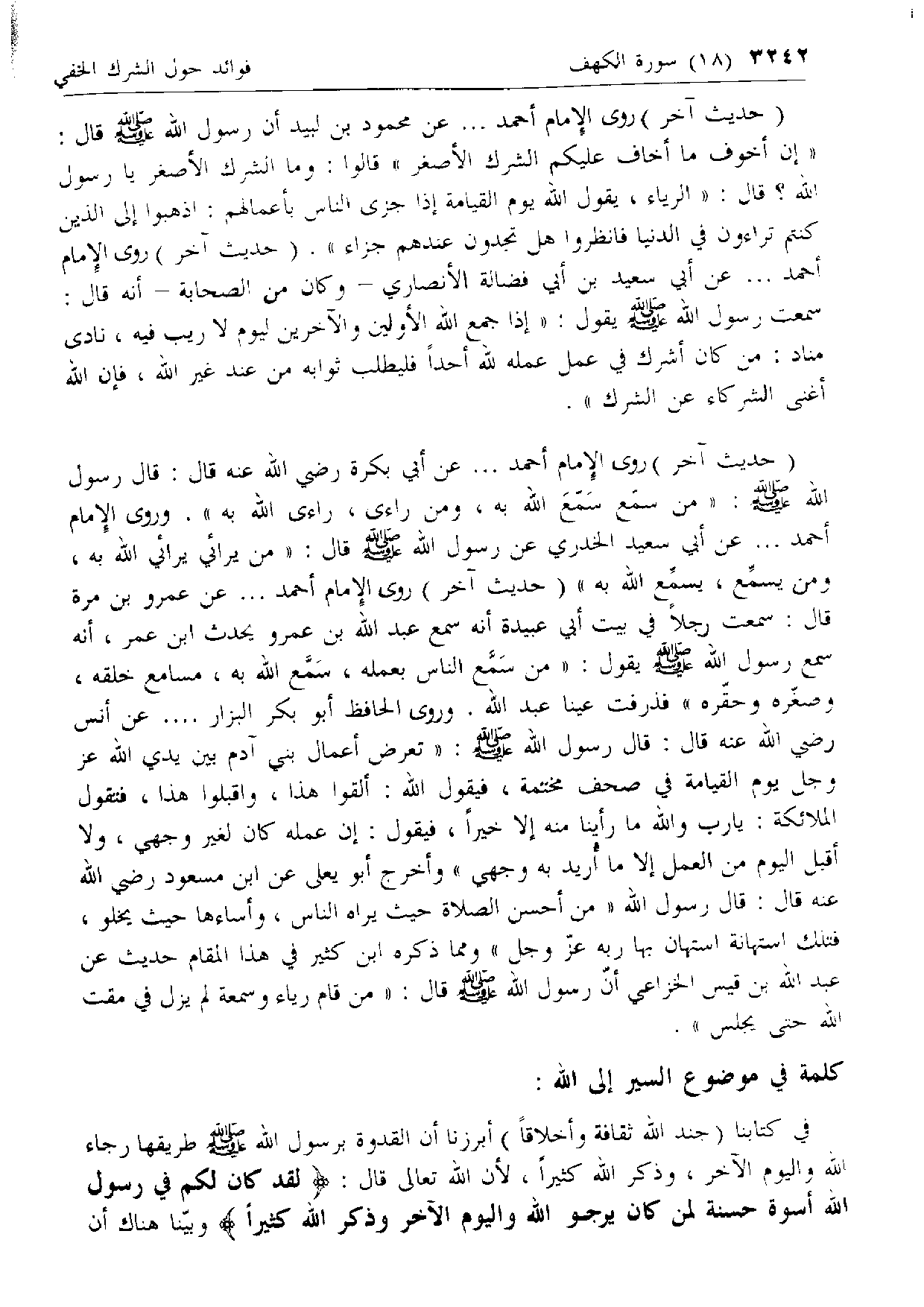 «إن أخوف ما أخاف عليكم الشرك الأصغر» قالوا: وما الشرك الأصغر يا رسول الله؟ قال: «الرياء، يقول الله يوم القيامة إذا جزى الناس بأعمالهم: اذهبوا إلى الذين كنتم تراءون في الدنيا فانظروا هل تجدون عندهم جزاء». (حديث آخر) روى الإمام أحمد ... عن أبي سعيد بن أبي فضالة الأنصاري- وكان من الصحابة- أنه قال: