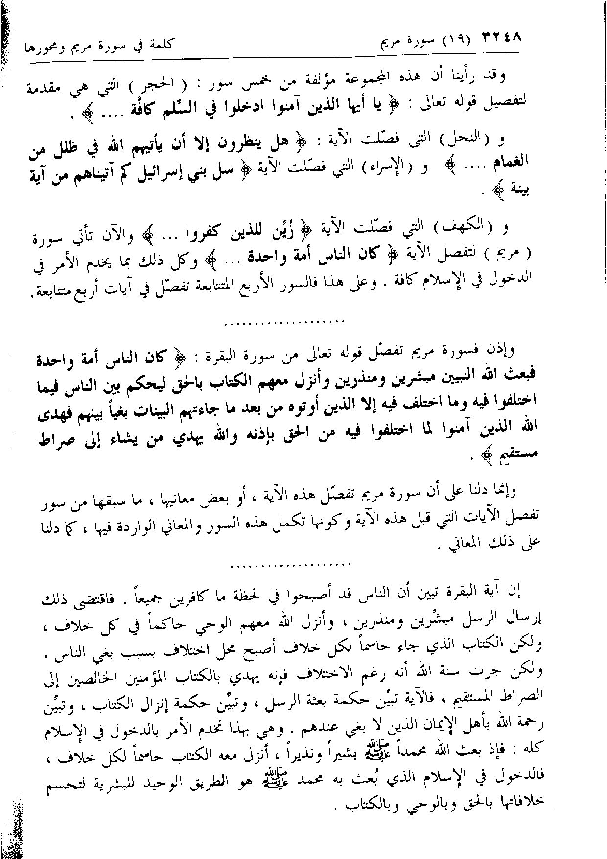 وإذن فسورة مريم تفصّل قوله تعالى من سورة البقرة: كانَ النَّاسُ أُمَّةً واحِدَةً فَبَعَثَ اللَّهُ النَّبِيِّينَ مُبَشِّرِينَ وَمُنْذِرِينَ وَأَنْزَلَ مَعَهُمُ الْكِتابَ بِالْحَقِّ لِيَحْكُمَ بَيْنَ النَّاسِ فِيمَا