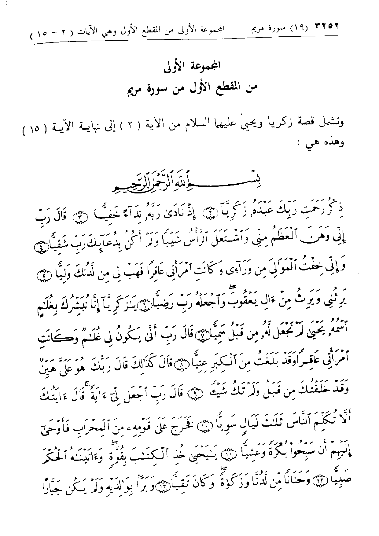 المجموعة الأولى من المقطع الأول من سورة مريم وتشمل قصة زكريا ويحيى عليهما السلام من الآية (2) إلى نهاية الآية (15) وهذه هي: