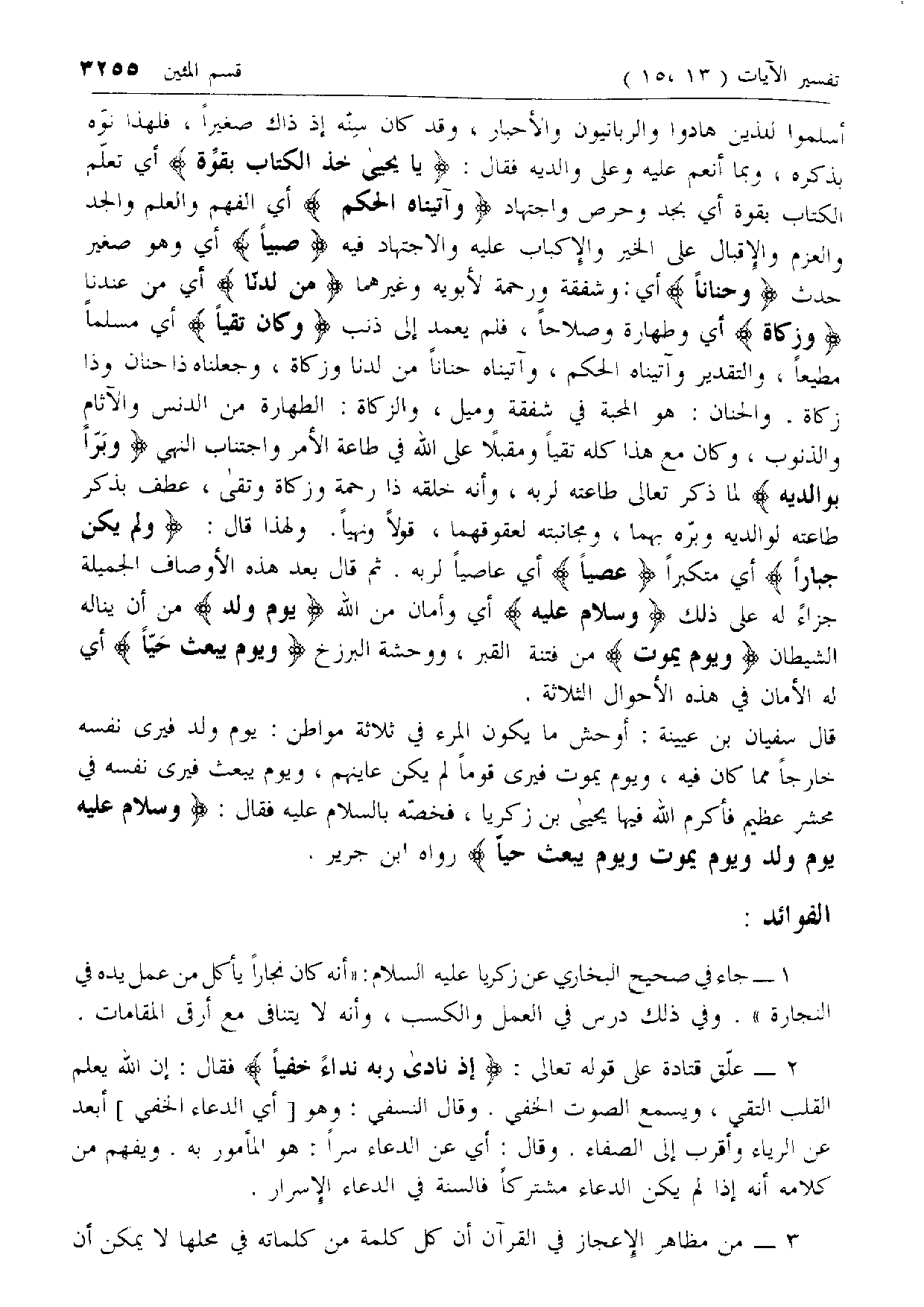أسلموا للذين هادوا والربانيون والأحبار، وقد كان سنّه إذ ذاك صغيرا، فلهذا نوّه بذكره، وبما أنعم عليه وعلى والديه فقال: يا يَحْيى خُذِ الْكِتابَ بِقُوَّةٍ أي تعلّم الكتاب بقوة أي بجد وحرص واجتهاد وَآتَيْناهُ الْحُكْمَ أي الفهم والعلم والجد والعزم والإقبال على الخير والإكباب عليه والاجتهاد فيه صَبِيًّا أي وهو صغير حدث