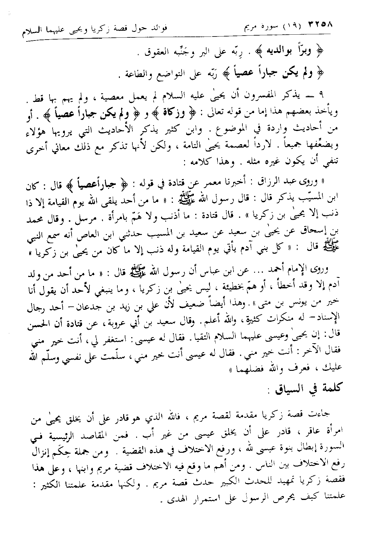 «وروى عبد الرزاق: أخبرنا معمر عن قتادة في قوله: جَبَّاراً عَصِيًّا قال: كان ابن المسيّب يذكر قال: قال رسول الله صلّى الله عليه وسلّم: «ما من أحد يلقى الله يوم القيامة إلا ذا ذنب إلا يحيى بن زكريا». قال قتادة: ما أذنب ولا همّ بامرأة. مرسل. وقال محمد بن إسحاق عن يحيى بن سعيد عن سعيد بن المسيب حدثني ابن العاص أنه سمع النبي صلّى الله عليه وسلّم قال: «كل بني آدم يأتي يوم القيامة وله ذنب إلا ما كان من يحيى بن زكريا»