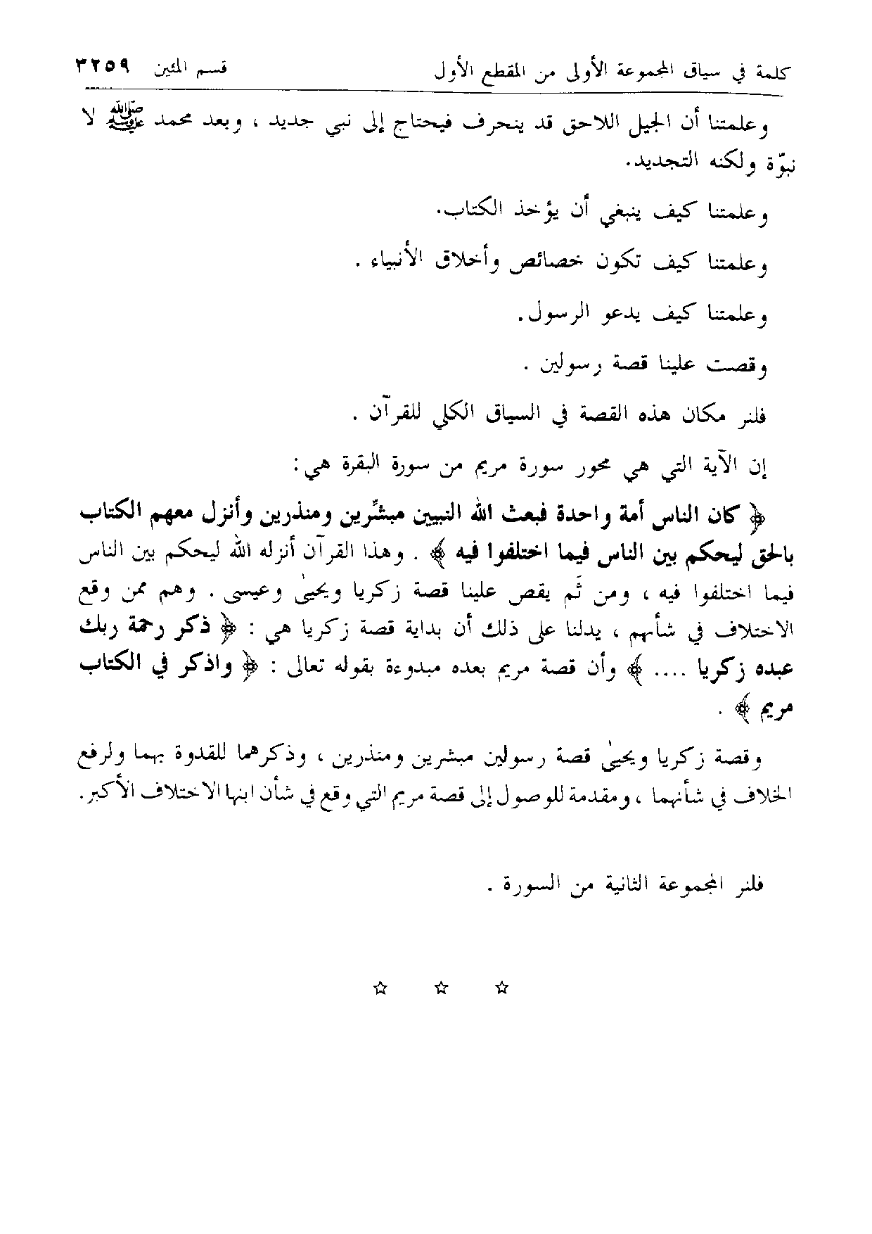 كانَ النَّاسُ أُمَّةً واحِدَةً فَبَعَثَ اللَّهُ النَّبِيِّينَ مُبَشِّرِينَ وَمُنْذِرِينَ وَأَنْزَلَ مَعَهُمُ الْكِتابَ بِالْحَقِّ لِيَحْكُمَ بَيْنَ النَّاسِ فِيمَا اخْتَلَفُوا فِيهِ. وهذا القرآن أنزله الله ليحكم بين الناس فيما اختلفوا فيه، ومن ثم يقص علينا قصة زكريا ويحيى وعيسى. وهم ممن وقع الاختلاف في شأنهم، يدلنا على ذلك أن بداية قصة زكريا هي: ذِكْرُ رَحْمَتِ رَبِّكَ عَبْدَهُ زَكَرِيَّا .... وأن قصة مريم بعده مبدوءة بقوله تعالى: وَاذْكُرْ فِي الْكِتابِ مَرْيَمَ.