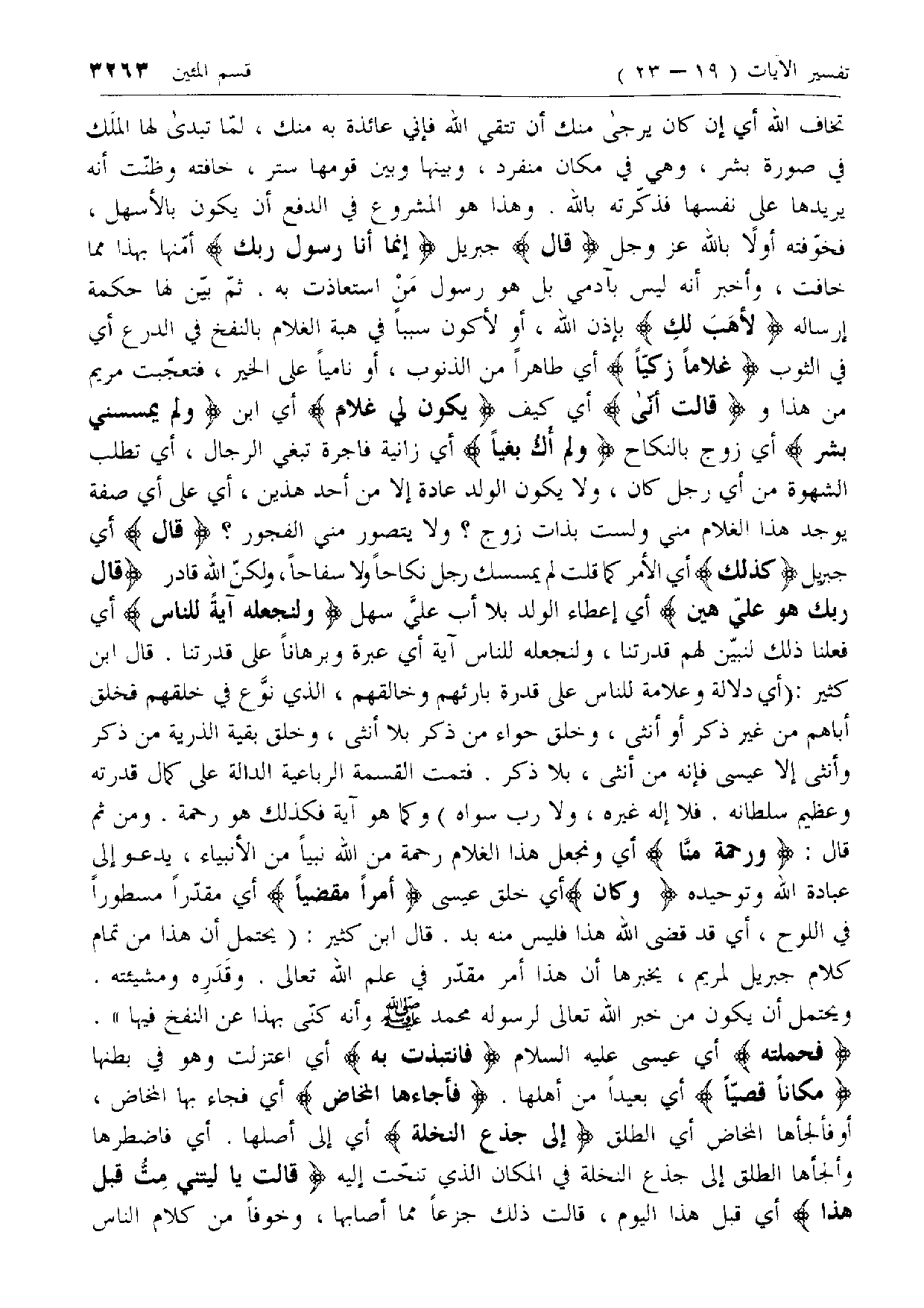 قالَ جبريل إِنَّما أَنَا رَسُولُ رَبِّكِ أمّنها بهذا مما خافت، وأخبر أنه ليس بآدمي بل هو رسول من استعاذت به. ثمّ بيّن لها حكمة إرساله لِأَهَبَ لَكِ بإذن الله، أو لأكون سببا في هبة الغلام بالنفخ في الدرع أي في الثوب غُلاماً زَكِيًّا أي طاهرا من الذنوب، أو ناميا على الخير، فتعجّبت مريم من هذا
