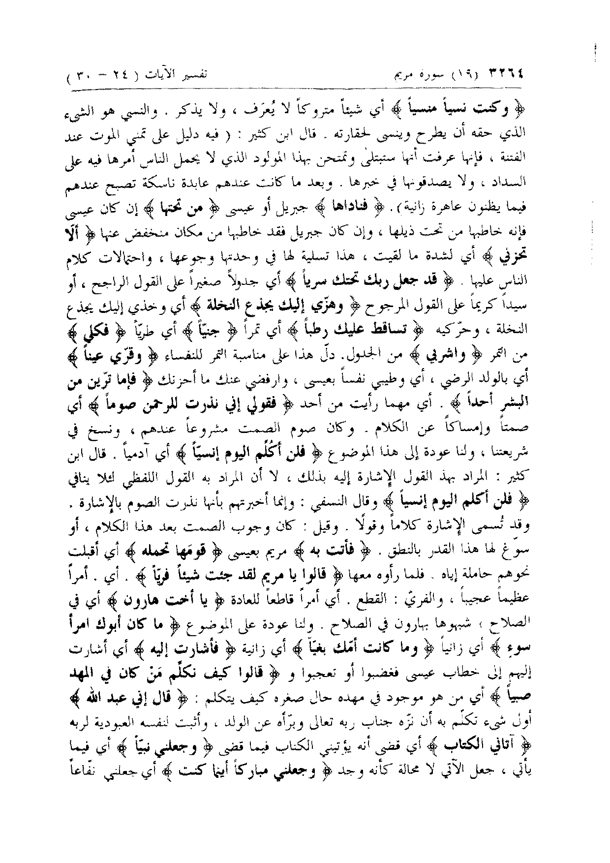 فَكُلِي من التمر وَاشْرَبِي من الجدول. دلّ هذا على مناسبة التمر للنفساء وَقَرِّي عَيْناً أي بالولد الرضي، أي وطيبي نفسا بعيسى، وارفضي عنك ما أحزنك فَإِمَّا تَرَيِنَّ مِنَ الْبَشَرِ أَحَداً. أي مهما رأيت من أحد فَقُولِي إِنِّي نَذَرْتُ لِلرَّحْمنِ صَوْماً أي صمتا وإمساكا عن الكلام. وكان صوم الصمت مشروعا عندهم، ونسخ في شريعتنا، ولنا عودة إلى هذا الموضوع فَلَنْ أُكَلِّمَ الْيَوْمَ إِنْسِيًّا أي آدميا. قال ابن كثير: المراد بهذا القول الإشارة إليه بذلك، لا أن المراد به القول اللفظي لئلا ينافي فَلَنْ أُكَلِّمَ الْيَوْمَ إِنْسِيًّا وقال النسفي: وإنما أخبرتهم بأنها نذرت الصوم بالإشارة.