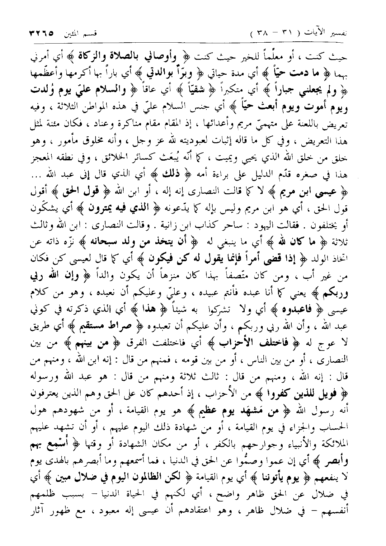 وَالسَّلامُ عَلَيَّ يَوْمَ وُلِدْتُ وَيَوْمَ أَمُوتُ وَيَوْمَ أُبْعَثُ حَيًّا أي جنس السلام عليّ في هذه المواطن الثلاثة، وفيه تعريض باللعنة على متهميّ مريم وأعدائها، إذ المقام مقام مناكرة وعناد، فكان مئنة لمثل هذا التعريض، وفي كل ما قاله إثبات لعبوديته لله عزّ وجل، وأنه مخلوق مأمور، وهو خلق من خلق الله الذي يحيي ويميت، كما أنّه يبعث كسائر الخلائق، وفي نطقه المعجز هذا في صغره قدّم الدليل على براءة أمه