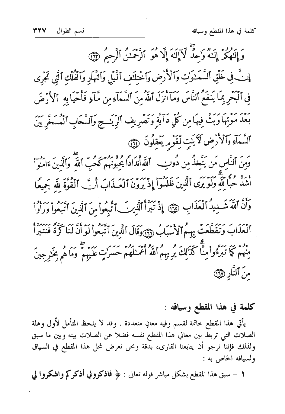 وَإِلهُكُمْ إِلهٌ واحِدٌ لا إِلهَ إِلاَّ هُوَ الرَّحْمنُ الرَّحِيمُ (163) إِنَّ فِي خَلْقِ السَّماواتِ وَالْأَرْضِ وَاخْتِلافِ اللَّيْلِ وَالنَّهارِ وَالْفُلْكِ الَّتِي تَجْرِي فِي الْبَحْرِ بِما يَنْفَعُ النَّاسَ وَما أَنْزَلَ اللَّهُ مِنَ السَّماءِ مِنْ ماءٍ فَأَحْيا بِهِ الْأَرْضَ بَعْدَ مَوْتِها وَبَثَّ فِيها مِنْ كُلِّ دَابَّةٍ وَتَصْرِيفِ الرِّياحِ وَالسَّحابِ الْمُسَخَّرِ بَيْنَ السَّماءِ وَالْأَرْضِ لَآياتٍ لِقَوْمٍ يَعْقِلُونَ (164) وَمِنَ النَّاسِ مَنْ يَتَّخِذُ مِنْ دُونِ اللَّهِ أَنْداداً يُحِبُّونَهُمْ كَحُبِّ اللَّهِ وَالَّذِينَ آمَنُوا أَشَدُّ حُبًّا لِلَّهِ وَلَوْ يَرَى الَّذِينَ ظَلَمُوا إِذْ يَرَوْنَ الْعَذابَ أَنَّ الْقُوَّةَ لِلَّهِ جَمِيعاً وَأَنَّ اللَّهَ شَدِيدُ الْعَذابِ (165) إِذْ تَبَرَّأَ الَّذِينَ اتُّبِعُوا مِنَ الَّذِينَ اتَّبَعُوا وَرَأَوُا الْعَذابَ وَتَقَطَّعَتْ بِهِمُ الْأَسْبابُ (166) وَقالَ الَّذِينَ اتَّبَعُوا لَوْ أَنَّ لَنا كَرَّةً فَنَتَبَرَّأَ مِنْهُمْ كَما تَبَرَّؤُا مِنَّا كَذلِكَ يُرِيهِمُ اللَّهُ أَعْمالَهُمْ حَسَراتٍ عَلَيْهِمْ وَما هُمْ بِخارِجِينَ مِنَ النَّارِ (167)