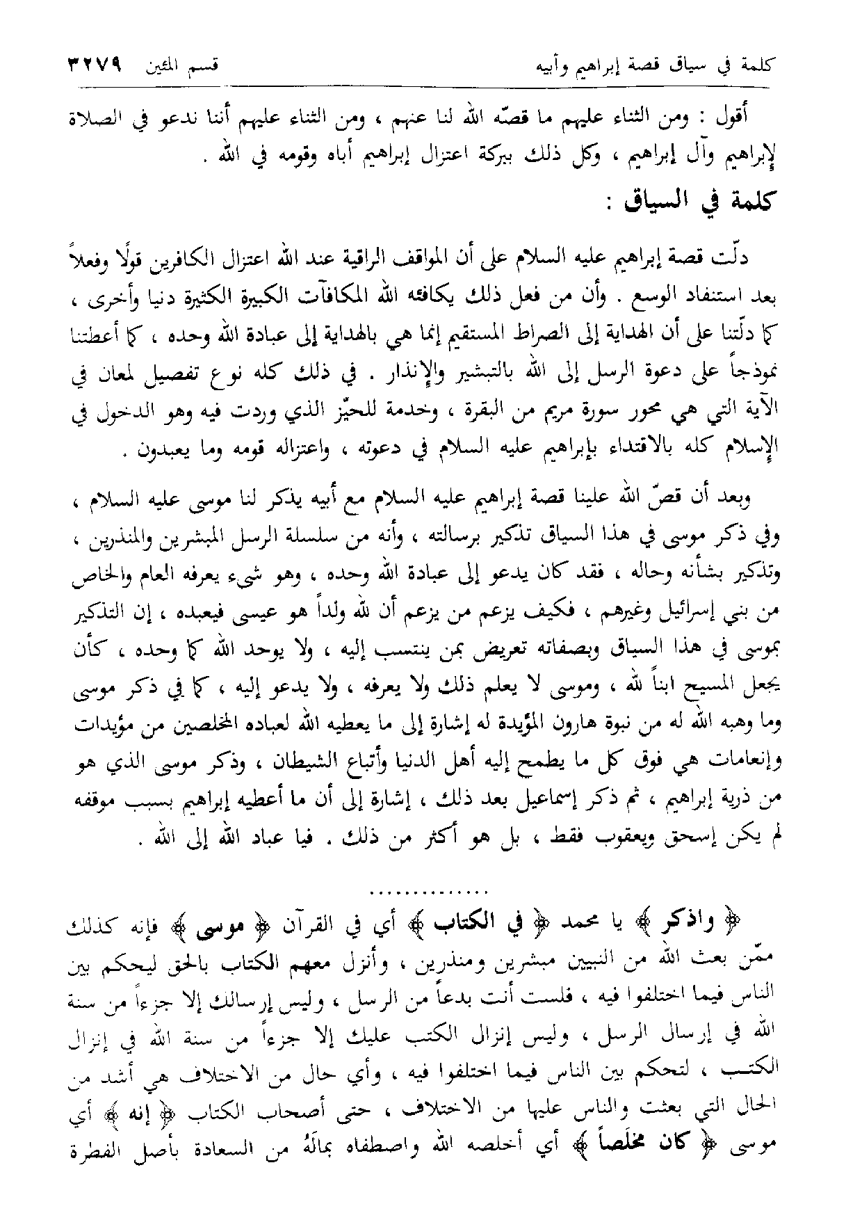 وبعد أن قصّ الله علينا قصة إبراهيم عليه السلام مع أبيه يذكر لنا موسى عليه السلام، وفي ذكر موسى في هذا السياق تذكير برسالته، وأنه من سلسلة الرسل المبشرين والمنذرين، وتذكير بشأنه وحاله، فقد كان يدعو إلى عبادة الله وحده، وهو شئ يعرفه العام والخاص من بني إسرائيل وغيرهم، فكيف يزعم من يزعم أن لله ولدا هو عيسى فيعبده، إن التذكير بموسى في هذا السياق وبصفاته تعريض بمن ينتسب إليه، ولا يوحد الله كما وحده، كأن يجعل المسيح ابنا لله، وموسى لا يعلم ذلك ولا يعرفه، ولا يدعو إليه، كما في ذكر موسى وما وهبه الله له من نبوة هارون المؤيدة له إشارة إلى ما يعطيه الله لعباده المخلصين من مؤيدات وإنعامات هي فوق كل ما يطمح إليه أهل الدنيا وأتباع الشيطان، وذكر موسى الذي هو من ذرية إبراهيم، ثم ذكر إسماعيل بعد ذلك، إشارة إلى أن ما أعطيه إبراهيم بسبب موقفه لم يكن إسحاق ويعقوب فقط، بل هو أكثر من ذلك. فيا عباد الله إلى الله.