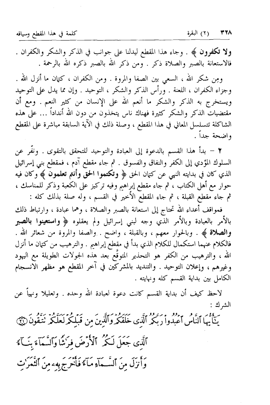 2 - بدأ هذا القسم بالدعوة إلى العبادة والتوحيد للتحقق بالتقوى. ونفر عن السلوك المؤدي إلى الكفر والنفاق والفسوق. ثم جاء مقطع آدم، فمقطع بني إسرائيل الذي كان في بدايته النهي عن كتمان الحق وَتَكْتُمُوا الْحَقَّ وَأَنْتُمْ تَعْلَمُونَ وكان فيه حوار مع أهل الكتاب، ثم جاء مقطع إبراهيم وفيه تركيز على الكعبة وذكر للمناسك، ثم جاء مقطع القبلة، ثم جاء المقطع الأخير في القسم، وله صلة بذلك كله: