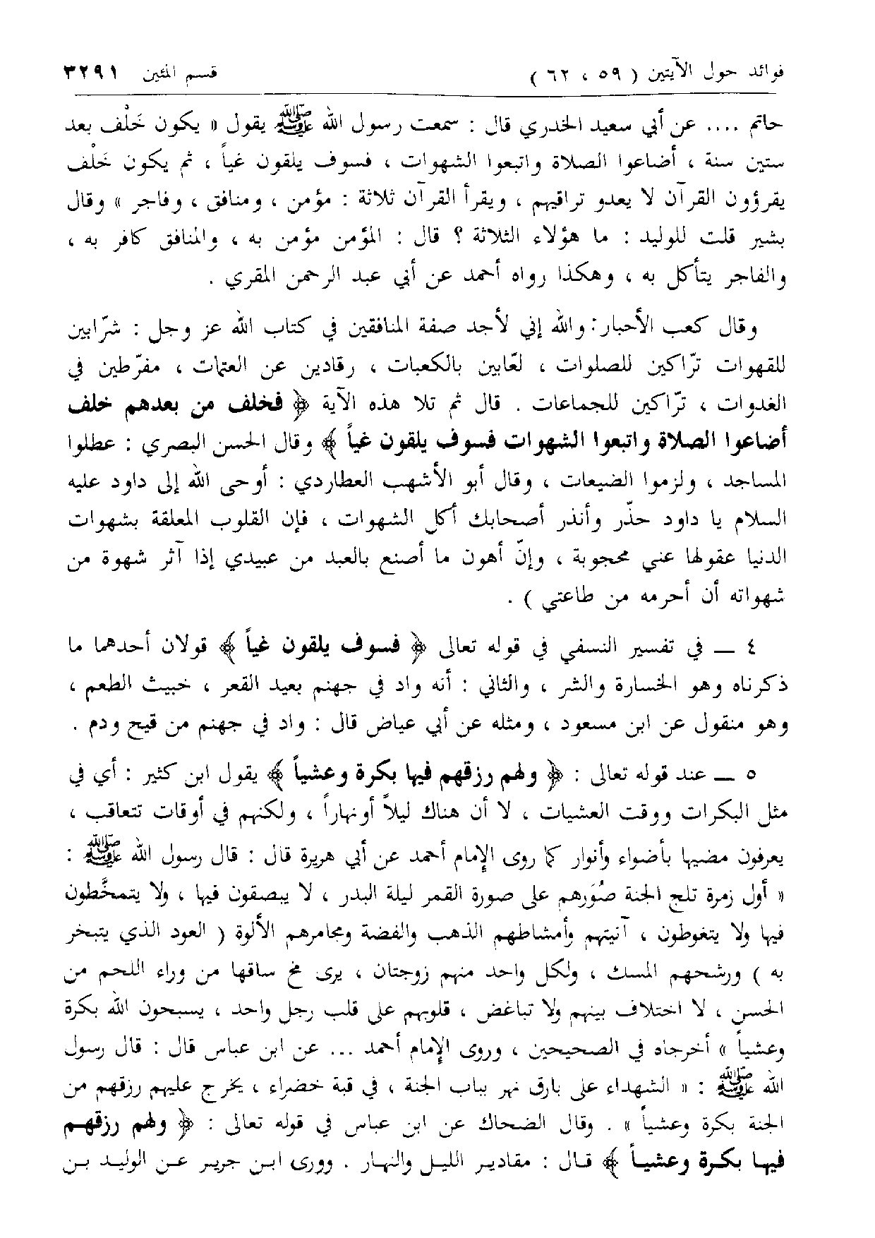 حاتم .... عن أبي سعيد الخدري قال: سمعت رسول الله صلّى الله عليه وسلّم يقول «يكون خلف بعد ستين سنة، أضاعوا الصلاة واتبعوا الشهوات، فسوف يلقون غيا، ثم يكون خلف يقرءون القرآن لا يعدو تراقيهم، ويقرأ القرآن ثلاثة: مؤمن، ومنافق، وفاجر» وقال بشير قلت للوليد: ما هؤلاء الثلاثة؟ قال: المؤمن مؤمن به، والمنافق كافر به، والفاجر يتأكل به، وهكذا رواه أحمد عن أبي عبد الرحمن المقري.