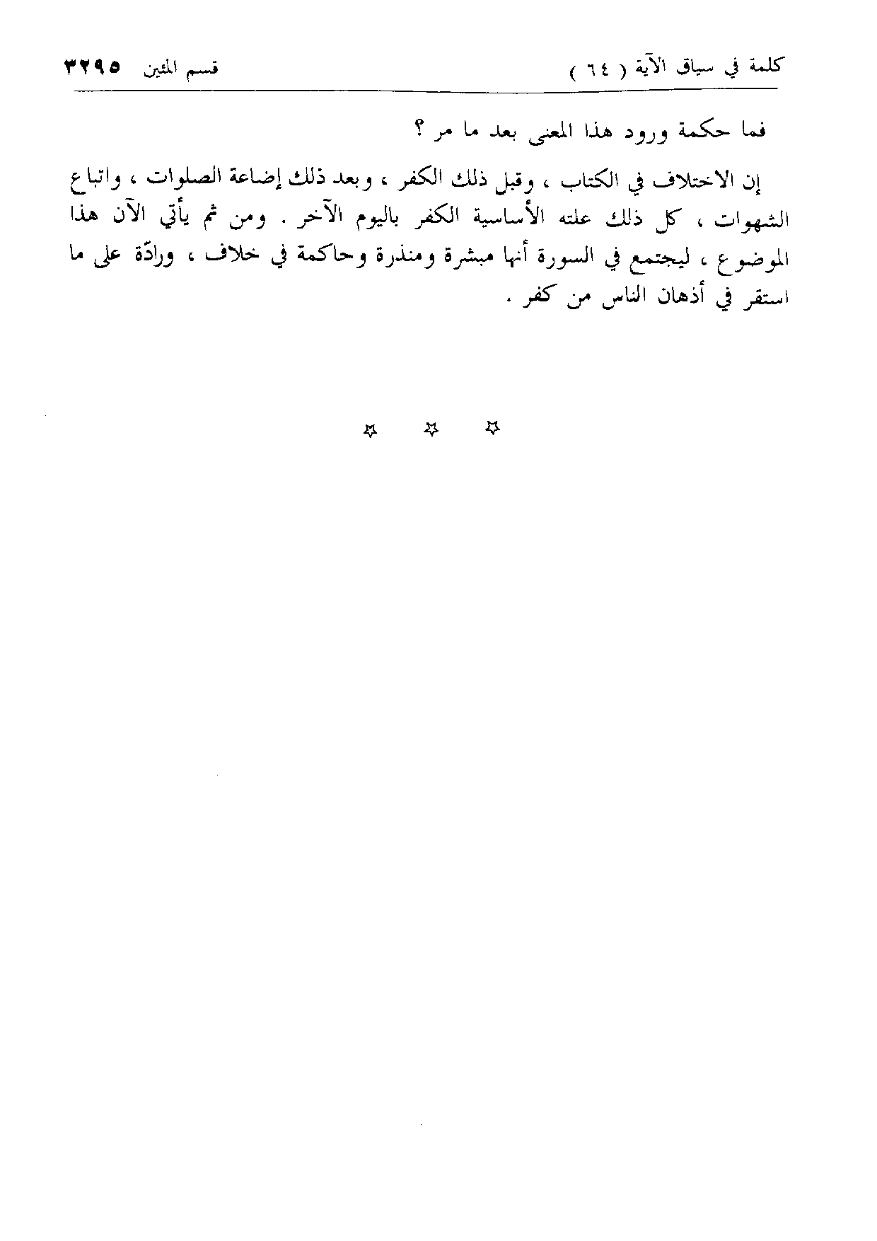 إن الاختلاف في الكتاب، وقبل ذلك الكفر، وبعد ذلك إضاعة الصلوات، واتباع الشهوات، كل ذلك علته الأساسية الكفر باليوم الآخر. ومن ثم يأتي الآن هذا الموضوع، ليجتمع في السورة أنها مبشرة ومنذرة وحاكمة في خلاف، ورادّة على ما استقر في أذهان الناس من كفر.