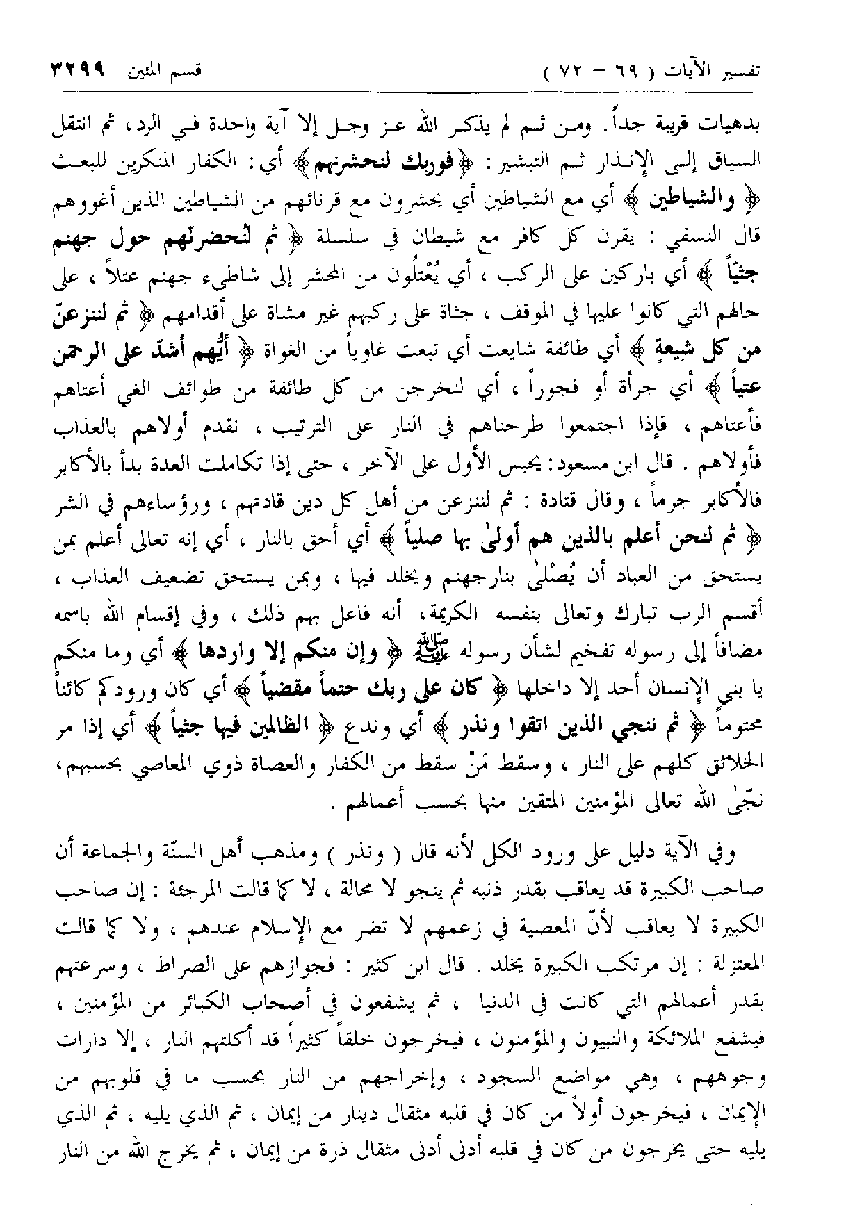 ثُمَّ لَنَنْزِعَنَّ مِنْ كُلِّ شِيعَةٍ أي طائفة شايعت أي تبعت غاويا من الغواة أَيُّهُمْ أَشَدُّ عَلَى الرَّحْمنِ عِتِيًّا أي جرأة أو فجورا، أي لنخرجن من كل طائفة من طوائف الغي أعتاهم فأعتاهم، فإذا اجتمعوا طرحناهم في النار على الترتيب، نقدم أولاهم بالعذاب فأولاهم. قال ابن مسعود: يحبس الأول على الآخر، حتى إذا تكاملت العدة بدأ بالأكابر فالأكابر جرما، وقال قتادة: ثم لننزعن من أهل كل دين قادتهم، ورؤساءهم في الشر