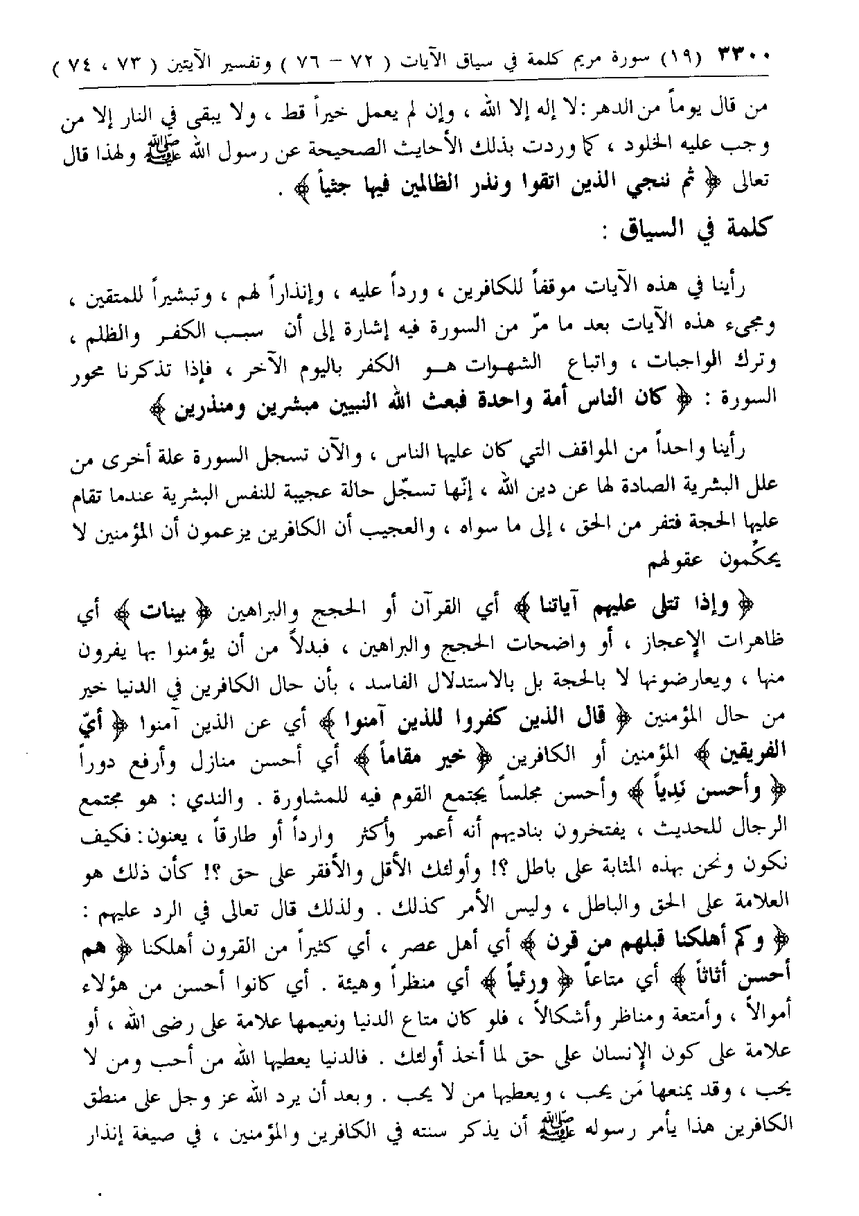 وَكَمْ أَهْلَكْنا قَبْلَهُمْ مِنْ قَرْنٍ أي أهل عصر، أي كثيرا من القرون أهلكنا هُمْ أَحْسَنُ أَثاثاً أي متاعا وَرِءْياً أي منظرا وهيئة. أي كانوا أحسن من هؤلاء أموالا، وأمتعة ومناظر وأشكالا، فلو كان متاع الدنيا ونعيمها علامة على رضى الله، أو علامة على كون الإنسان على حق لما أخذ أولئك. فالدنيا يعطيها الله من أحب ومن لا يحب، وقد يمنعها من يحب، ويعطيها من لا يحب. وبعد أن يرد الله عزّ وجل على منطق الكافرين هذا يأمر رسوله صلّى الله عليه وسلّم أن يذكر سنته في الكافرين والمؤمنين، في صيغة إنذار