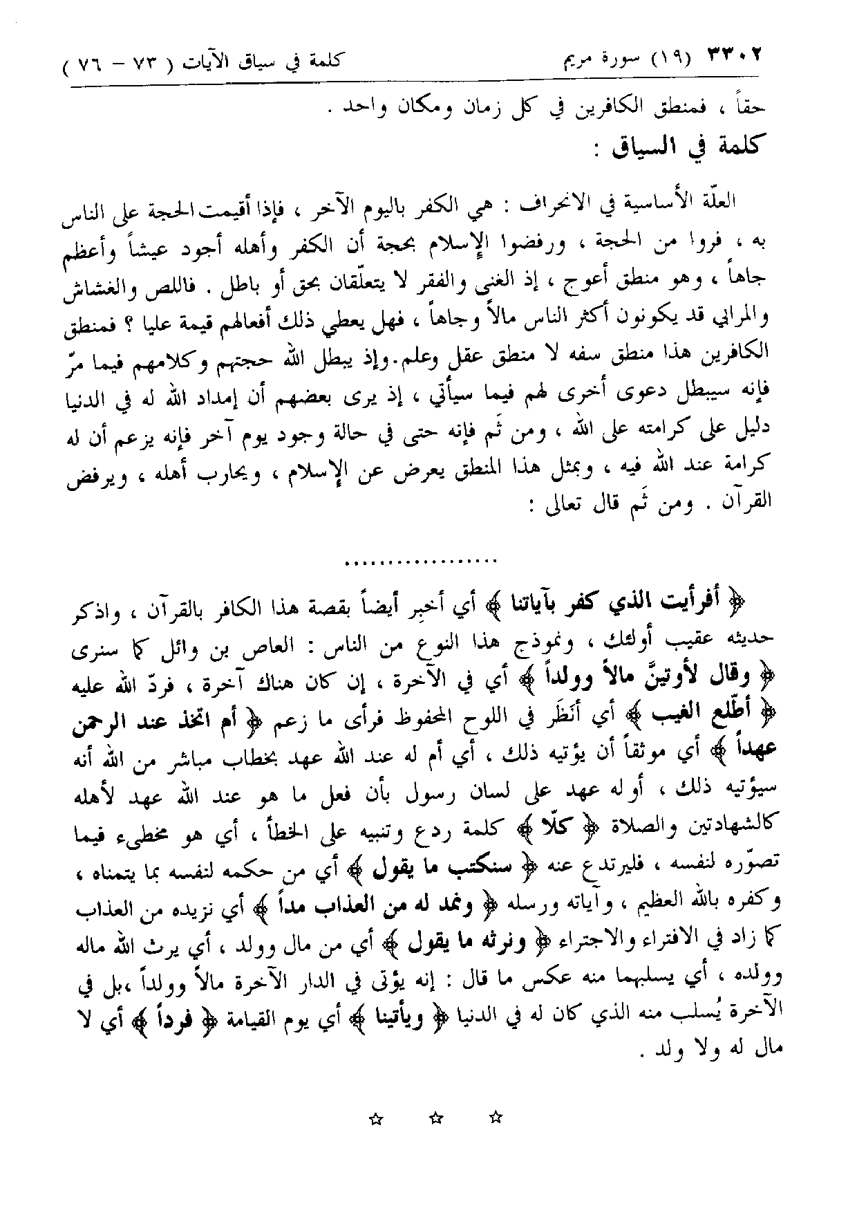 الكافرين هذا منطق سفه لا منطق عقل وعلم. وإذ يبطل الله حجتهم وكلامهم فيما مرّ فإنه سيبطل دعوى أخرى لهم فيها سيأتي، إذ يرى بعضهم أن إمداد الله له في الدنيا دليل على كرامته على الله، ومن ثم فإنه حتى في حالة وجود يوم آخر فإنه يزعم أن له كرامة عند الله فيه، وبمثل هذا المنطق يعرض عن الإسلام، ويحارب أهله، ويرفض القرآن. ومن ثم قال تعالى: