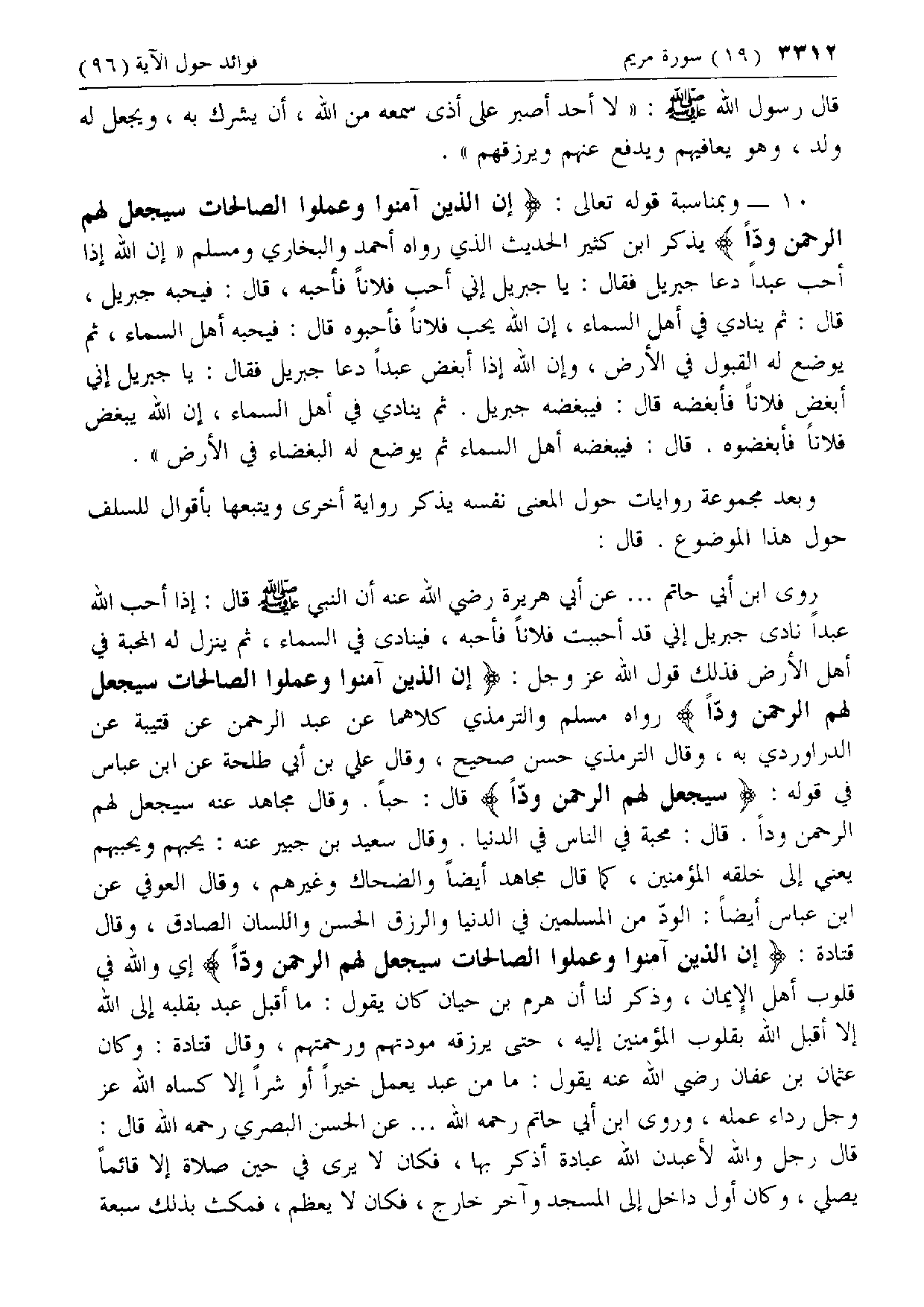 روى ابن أبي حاتم ... عن أبي هريرة رضي الله عنه أن النبي صلّى الله عليه وسلّم قال: إذا أحب الله عبدا نادى جبريل إني قد أحببت فلانا فأحبه، فينادى في السماء، ثم ينزل له المحبة في أهل الأرض فذلك قول الله عزّ وجل: إِنَّ الَّذِينَ آمَنُوا وَعَمِلُوا الصَّالِحاتِ سَيَجْعَلُ لَهُمُ الرَّحْمنُ وُدًّا رواه مسلم والترمذي كلاهما عن عبد الرحمن عن قتيبة عن الدراوردي به، وقال الترمذي حسن صحيح، وقال علي بن أبي طلحة عن ابن عباس في قوله: سَيَجْعَلُ لَهُمُ الرَّحْمنُ وُدًّا قال: حبا. وقال مجاهد عنه سيجعل لهم الرحمن ودا. قال: محبة في الناس في الدنيا. وقال سعيد بن جبير عنه: يحبهم ويحببهم يعني إلى خلقه المؤمنين، كما قال مجاهد أيضا والضحاك وغيرهم، وقال العوفي عن ابن عباس أيضا: الودّ من المسلمين في الدنيا والرزق الحسن واللسان الصادق، وقال قتادة: إِنَّ الَّذِينَ آمَنُوا وَعَمِلُوا الصَّالِحاتِ سَيَجْعَلُ لَهُمُ الرَّحْمنُ وُدًّا إي والله في قلوب أهل الإيمان، وذكر لنا أن هرم بن حيان كان يقول: ما أقبل عبد بقلبه إلى الله إلا أقبل الله بقلوب المؤمنين إليه، حتى يرزقه مودتهم ورحمتهم، وقال قتادة: وكان عثمان بن عفان رضي الله عنه يقول: ما من عبد يعمل خيرا أو شرا إلا كساه الله عزّ وجل رداء عمله، وروى ابن أبي حاتم رحمه الله ... عن الحسن البصري رحمه الله قال: