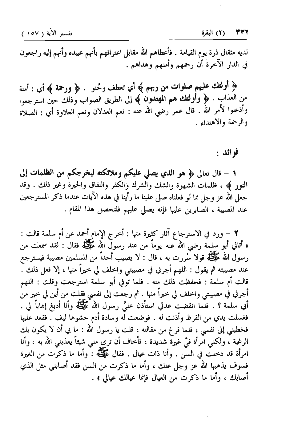 أُولئِكَ عَلَيْهِمْ صَلَواتٌ مِنْ رَبِّهِمْ أي تعطف وحنو. وَرَحْمَةٌ أي: أمنة من العذاب. وَأُولئِكَ هُمُ الْمُهْتَدُونَ إلى الطريق الصواب وذلك حين استرجعوا وأذعنوا لأمر الله. قال عمر رضي الله عنه: نعم العدلان ونعم العلاوة أي: الصلاة والرحمة والاهتداء.