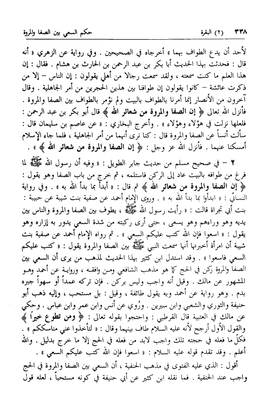 لأحد أن يدع الطواف بهما» أخرجاه في الصحيحين. وفي رواية عن الزهري «أنه قال: فحدثت بهذا الحديث أبا بكر بن عبد الرحمن بن الحارث بن هشام. فقال: إن هذا العلم ما كنت سمعته، ولقد سمعت رجالا من أهلي يقولون: إن الناس- إلا من ذكرت عائشة- كانوا يقولون إن طوافنا بين هذين الحجرين من أمر الجاهلية. وقال آخرون من الأنصار إنما أمرنا بالطواف بالبيت ولم نؤمر بالطواف بين الصفا والمروة.