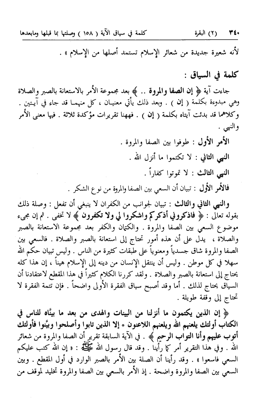 إِنَّ الَّذِينَ يَكْتُمُونَ ما أَنْزَلْنا مِنَ الْبَيِّناتِ وَالْهُدى مِنْ بَعْدِ ما بَيَّنَّاهُ لِلنَّاسِ فِي الْكِتابِ أُولئِكَ يَلْعَنُهُمُ اللَّهُ وَيَلْعَنُهُمُ اللَّاعِنُونَ* إِلَّا الَّذِينَ تابُوا وَأَصْلَحُوا وَبَيَّنُوا فَأُولئِكَ أَتُوبُ عَلَيْهِمْ وَأَنَا التَّوَّابُ الرَّحِيمُ. في الآية السابقة تقرير أن الصفا والمروة من شعائر الله. وفي هذا التقرير أمر كما رأينا. وقد قال رسول الله صلى الله عليه وسلم: «إن الله كتب عليكم السعي فاسعوا». وقد رأينا أن الصلة بين الأمر بالصبر الوارد في أول المقطع. وبين السعي بين الصفا والمروة واضحة. إذ الأمر بالسعي بين الصفا والمروة تخليد لموقف من