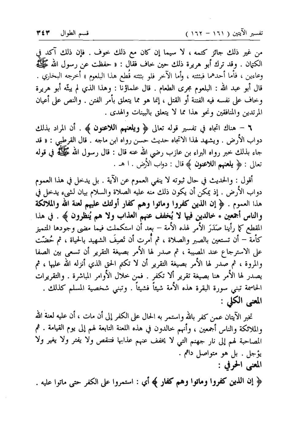 أقول: والحديث في حال ثبوته لا ينفي العموم عن الآية. بل يدخل في هذا العموم دواب الأرض. إذ يمكن أن يكون ذلك منه عليه الصلاة والسلام بيان لشئ يدخل في هذا العموم. إِنَّ الَّذِينَ كَفَرُوا وَماتُوا وَهُمْ كُفَّارٌ أُولئِكَ عَلَيْهِمْ لَعْنَةُ اللَّهِ وَالْمَلائِكَةِ وَالنَّاسِ أَجْمَعِينَ* خالِدِينَ فِيها لا يُخَفَّفُ عَنْهُمُ الْعَذابُ وَلا هُمْ يُنْظَرُونَ. في هذا المقطع كما رأينا صدر الأمر لهذه الأمة- بعد أن استكملت فيما مضى وجودها المتميز كأمة- أن تستعين بالصبر والصلاة، ثم أمرت أن تصف الشهيد بالحياة، ثم حضت على الاسترجاع عند المصيبة، ثم صدر لها الأمر بصيغة التقرير أن تسعى بين الصفا والمروة، ثم صدر لها الأمر بصيغة التقرير أن لا تكتم الحق الذي أنزله الله عليها، ثم يصدر لها الأمر هنا بصيغة تقرير ألا تكفر. فمن خلال الأوامر المباشرة. والتقريرات الحاسمة تبني سورة البقرة هذه الأمة شيئا فشيئا. وتبني شخصية المسلم كذلك.