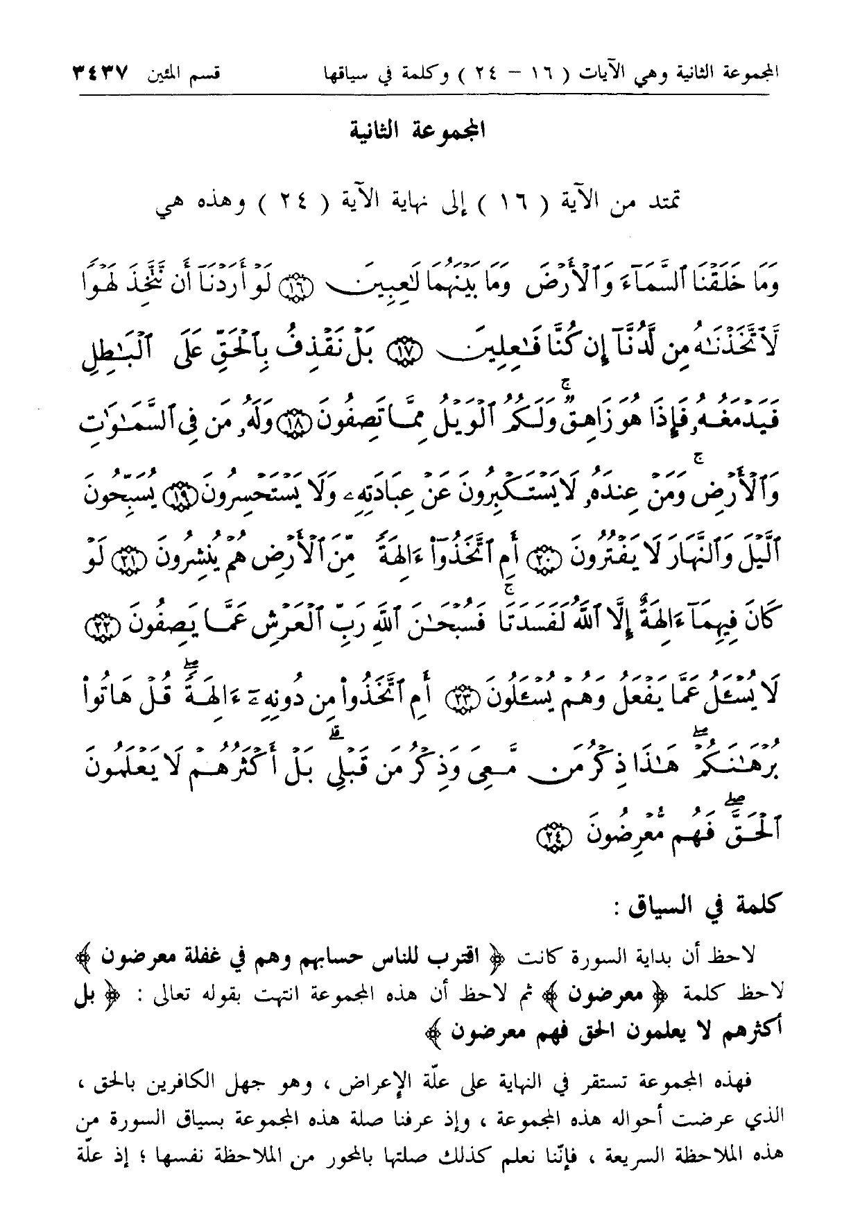 لاحظ أن بداية السورة كانت اقْتَرَبَ لِلنَّاسِ حِسابُهُمْ وَهُمْ فِي غَفْلَةٍ مُعْرِضُونَ لاحظ كلمة مُعْرِضُونَ ثم لاحظ أن هذه المجموعة انتهت بقوله تعالى: بَلْ أَكْثَرُهُمْ لا يَعْلَمُونَ الْحَقَّ فَهُمْ مُعْرِضُونَ