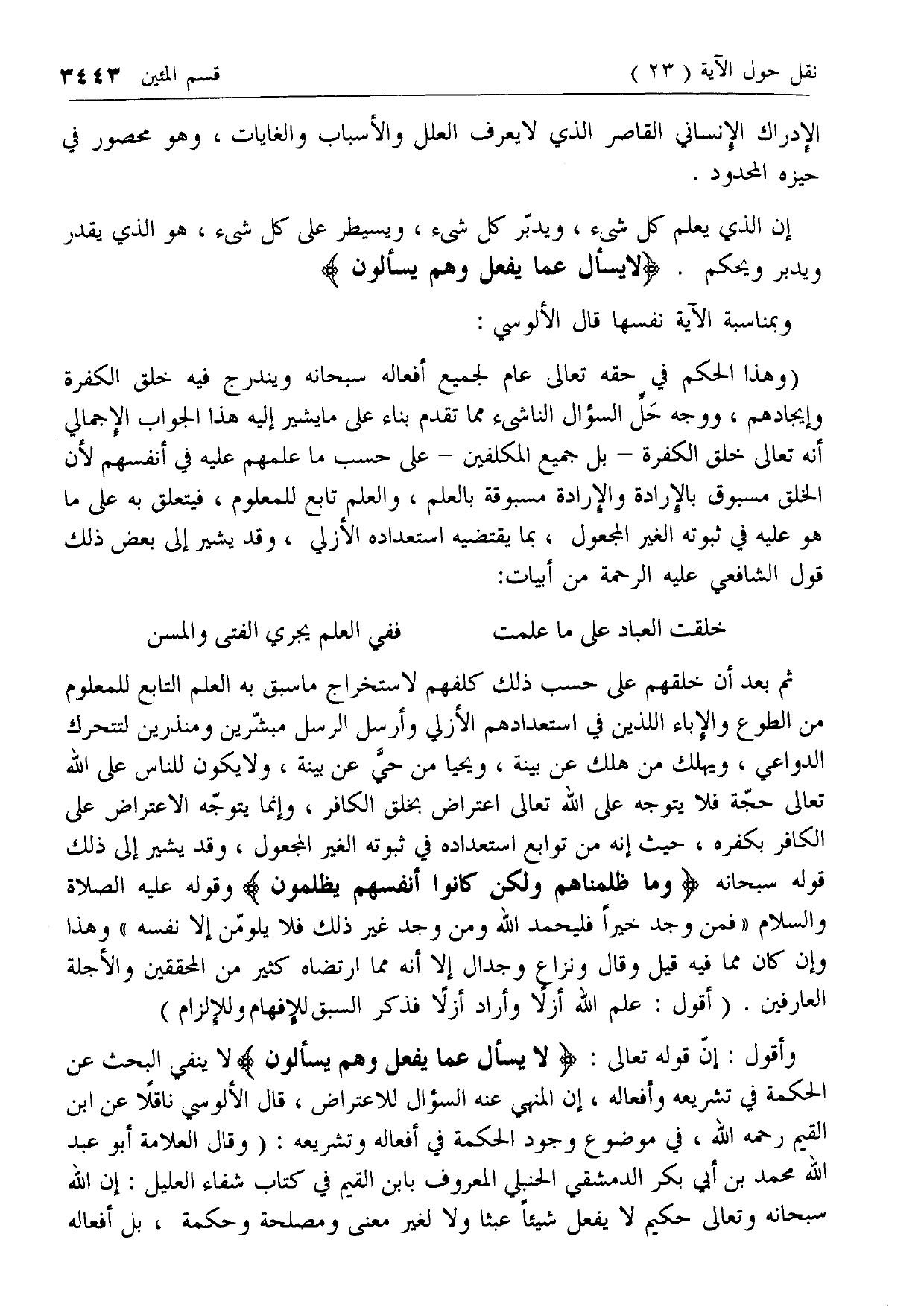 وأقول: إن قوله تعالى: لا يُسْئَلُ عَمَّا يَفْعَلُ وَهُمْ يُسْئَلُونَ لا ينفي البحث عن الحكمة في تشريعه وأفعاله، إن المنهي عنه السؤال للاعتراض، قال الألوسي ناقلا عن ابن القيم رحمه الله، في موضوع وجود الحكمة في أفعاله وتشريعه: (وقال العلامة أبو عبد الله محمد بن أبي بكر الدمشقي الحنبلي المعروف بابن القيم في كتاب شفاء العليل: إن الله سبحانه وتعالى حكيم لا يفعل شيئا عبثا ولا لغير معنى ومصلحة وحكمة، بل أفعاله
