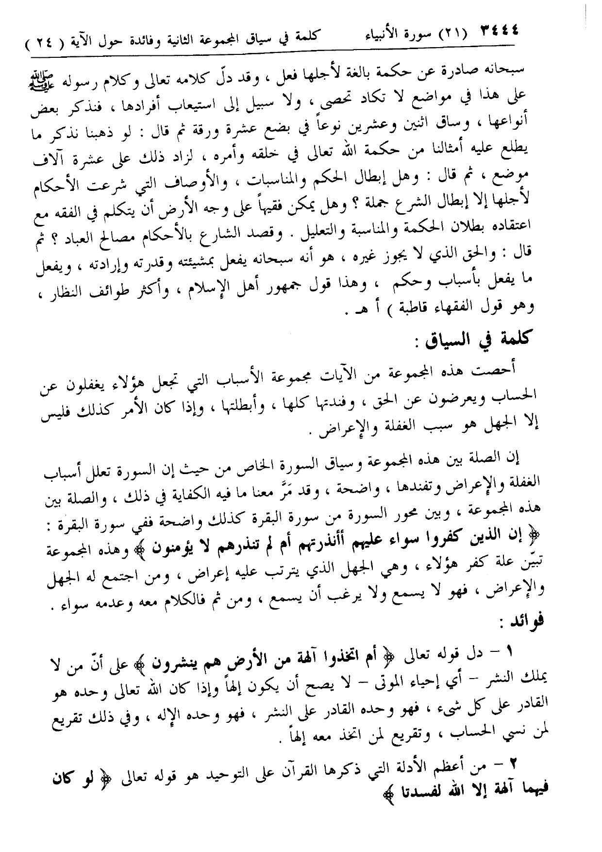 1 - دل قوله تعالى أَمِ اتَّخَذُوا آلِهَةً مِنَ الْأَرْضِ هُمْ يُنْشِرُونَ على أن من لا يملك النشر- أي إحياء الموتى- لا يصح أن يكون إلها وإذا كان الله تعالى وحده هو القادر على كل شئ، فهو وحده القادر على النشر، فهو وحده الإله، وفي ذلك تقريع لمن نسي الحساب، وتقريع لمن اتخذ معه إلها.