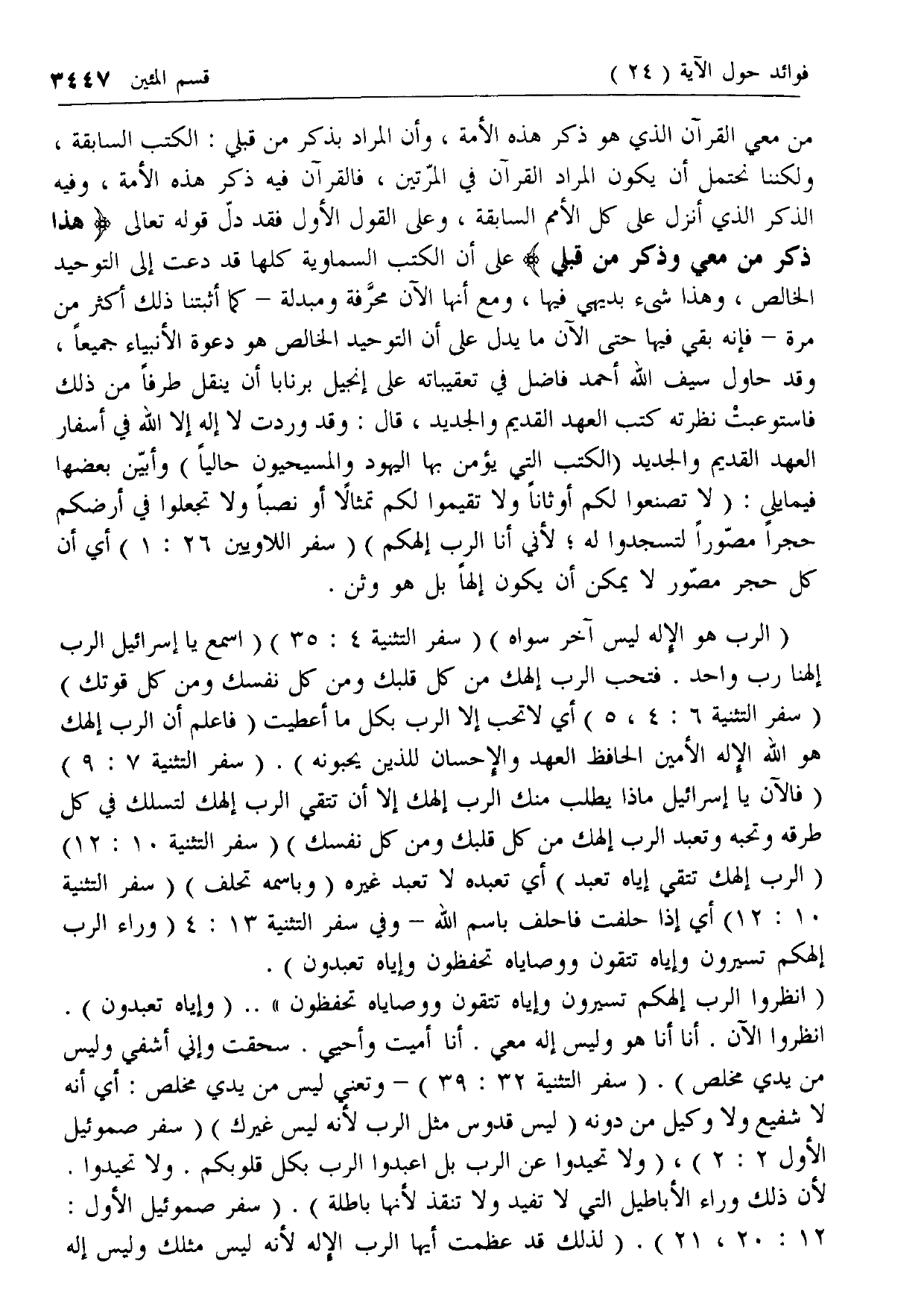 من معي القرآن الذي هو ذكر هذه الأمة، وأن المراد بذكر من قبلي: الكتب السابقة، ولكننا نحتمل أن يكون المراد القرآن في المرتين، فالقرآن فيه ذكر هذه الأمة، وفيه الذكر الذي أنزل على كل الأمم السابقة، وعلى القول الأول فقد دل قوله تعالى هذا ذِكْرُ مَنْ مَعِيَ وَذِكْرُ مَنْ قَبْلِي على أن الكتب السماوية كلها قد دعت إلى التوحيد الخالص، وهذا شئ بديهي فيها، ومع أنها الآن محرفة ومبدلة- كما أثبتنا ذلك أكثر من مرة- فإنه بقي فيها حتى الآن ما يدل على أن التوحيد الخالص هو دعوة الأنبياء جميعا، وقد حاول سيف الله أحمد فاضل في تعقيباته على إنجيل برنابا أن ينقل طرفا من ذلك فاستوعبت نظرته كتب العهد القديم والجديد، قال: وقد وردت لا إله إلا الله في أسفار العهد القديم والجديد (الكتب التي يؤمن بها اليهود والمسيحيون حاليا) وأبين بعضها فيما يلي: (لا تصنعوا لكم أوثانا ولا تقيموا لكم تمثالا أو نصبا ولا تجعلوا في أرضكم حجرا مصورا لتسجدوا له؛ لأني أنا الرب إلهكم) (سفر اللاويين 26: 1) أي أن كل حجر مصور لا يمكن أن يكون إلها بل هو وثن.