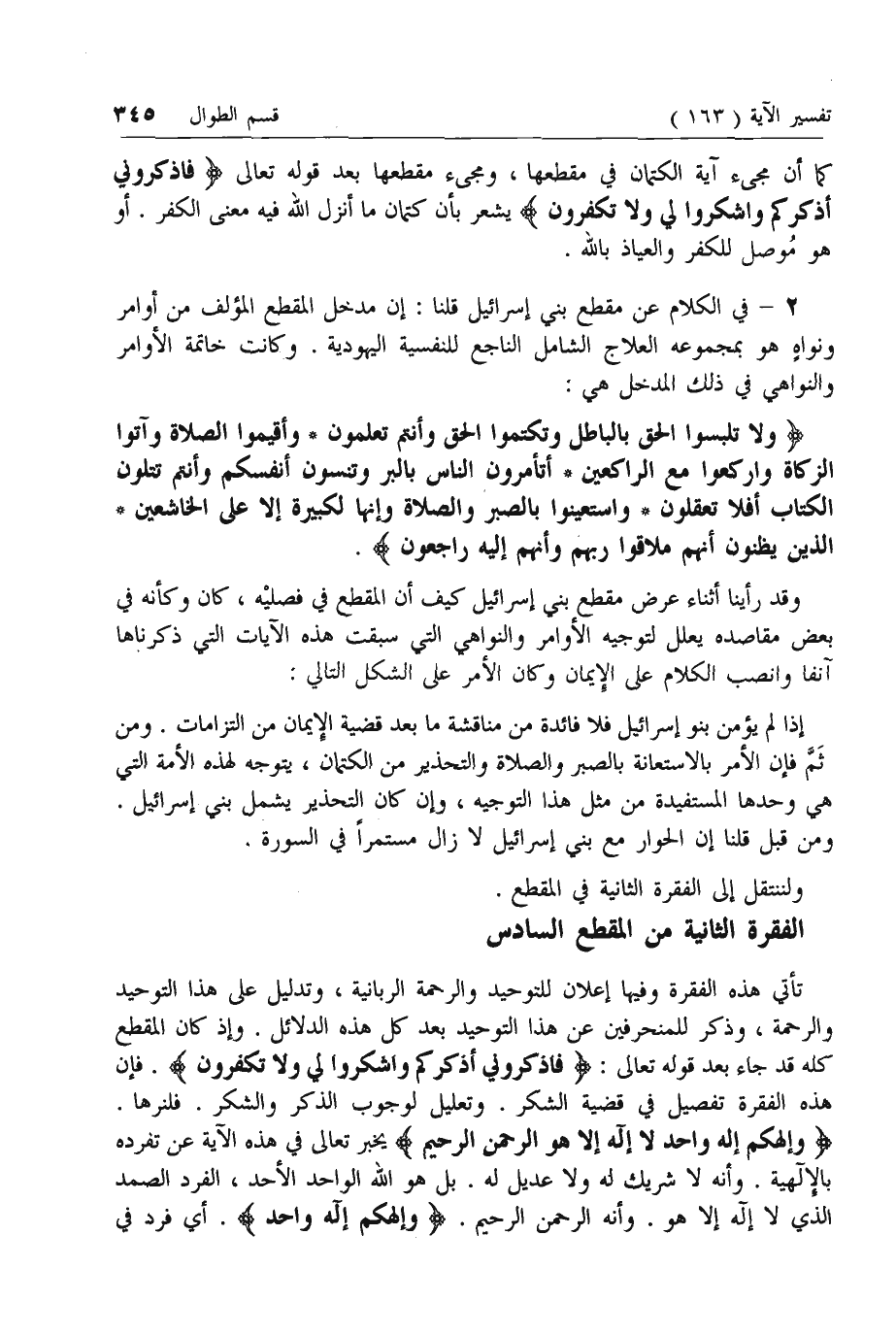 تأتي هذه الفقرة وفيها إعلان للتوحيد والرحمة الربانية، وتدليل على هذا التوحيد والرحمة، وذكر للمنحرفين عن هذا التوحيد بعد كل هذه الدلائل. وإذ كان المقطع كله قد جاء بعد قوله تعالى: فَاذْكُرُونِي أَذْكُرْكُمْ وَاشْكُرُوا لِي وَلا تَكْفُرُونِ. فإن هذه الفقرة تفصيل في قضية الشكر. وتعليل لوجوب الذكر والشكر. فلنرها.
