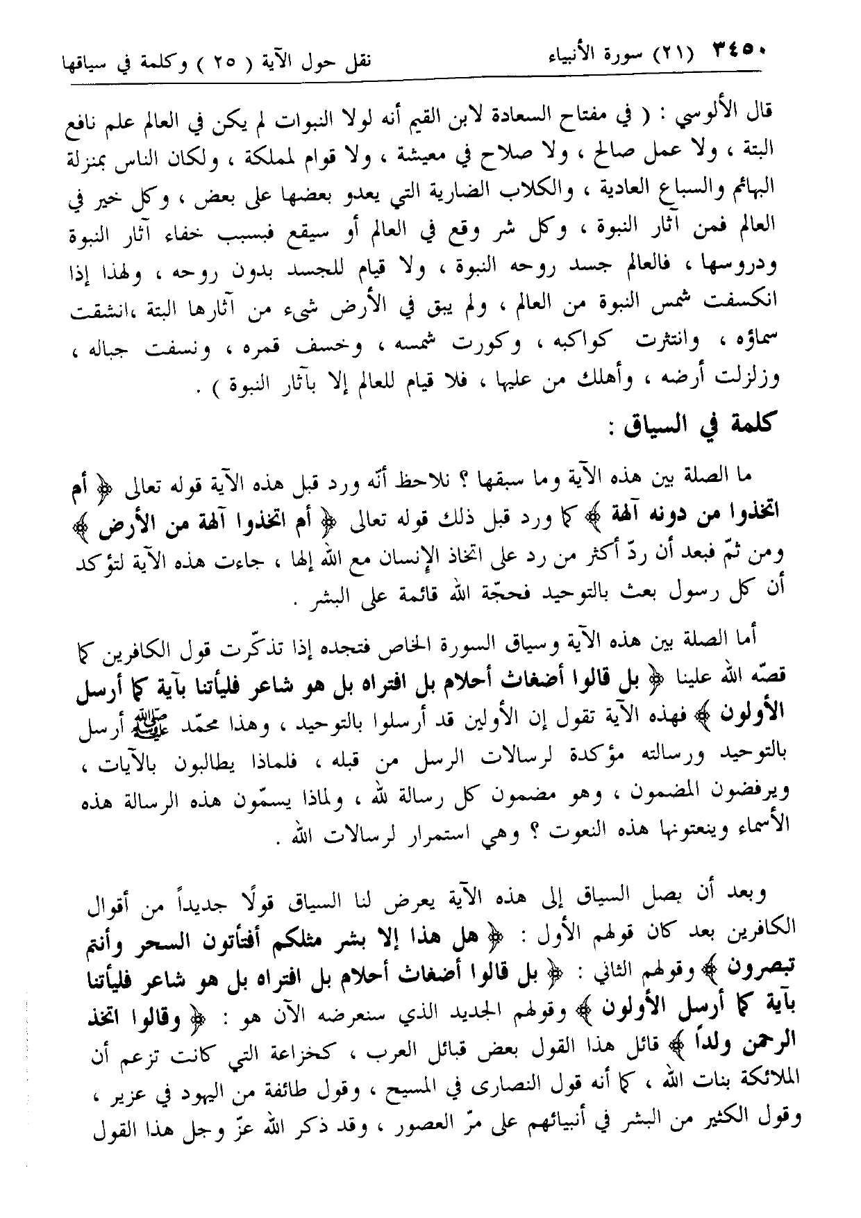 أما الصلة بين هذه الآية وسياق السورة الخاص فتجده إذا تذكرت قول الكافرين كما قصه الله علينا بَلْ قالُوا أَضْغاثُ أَحْلامٍ بَلِ افْتَراهُ بَلْ هُوَ شاعِرٌ فَلْيَأْتِنا بِآيَةٍ كَما أُرْسِلَ الْأَوَّلُونَ فهذه الآية تقول إن الأولين قد أرسلوا بالتوحيد، وهذا محمد صلى الله عليه وسلم أرسل بالتوحيد ورسالته مؤكدة لرسالات الرسل من قبله، فلماذا يطالبون بالآيات، ويرفضون المضمون، وهو مضمون كل رسالة لله، ولماذا يسمون هذه الرسالة هذه الأسماء وينعتونها هذه النعوت؟ وهي استمرار لرسالات الله.