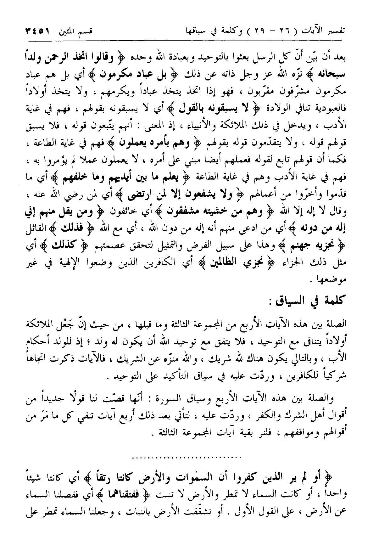 الصلة بين هذه الآيات الأربع من المجموعة الثالثة وما قبلها، من حيث إن جعل الملائكة أولادا يتنافى مع التوحيد، فلا يتفق مع توحيد الله أن يكون له ولد؛ إذ للولد أحكام الأب، وبالتالي يكون هناك لله شريك، والله منزه عن الشريك، فالآيات ذكرت اتجاها شركيا للكافرين، وردت عليه في سياق التأكيد على التوحيد.