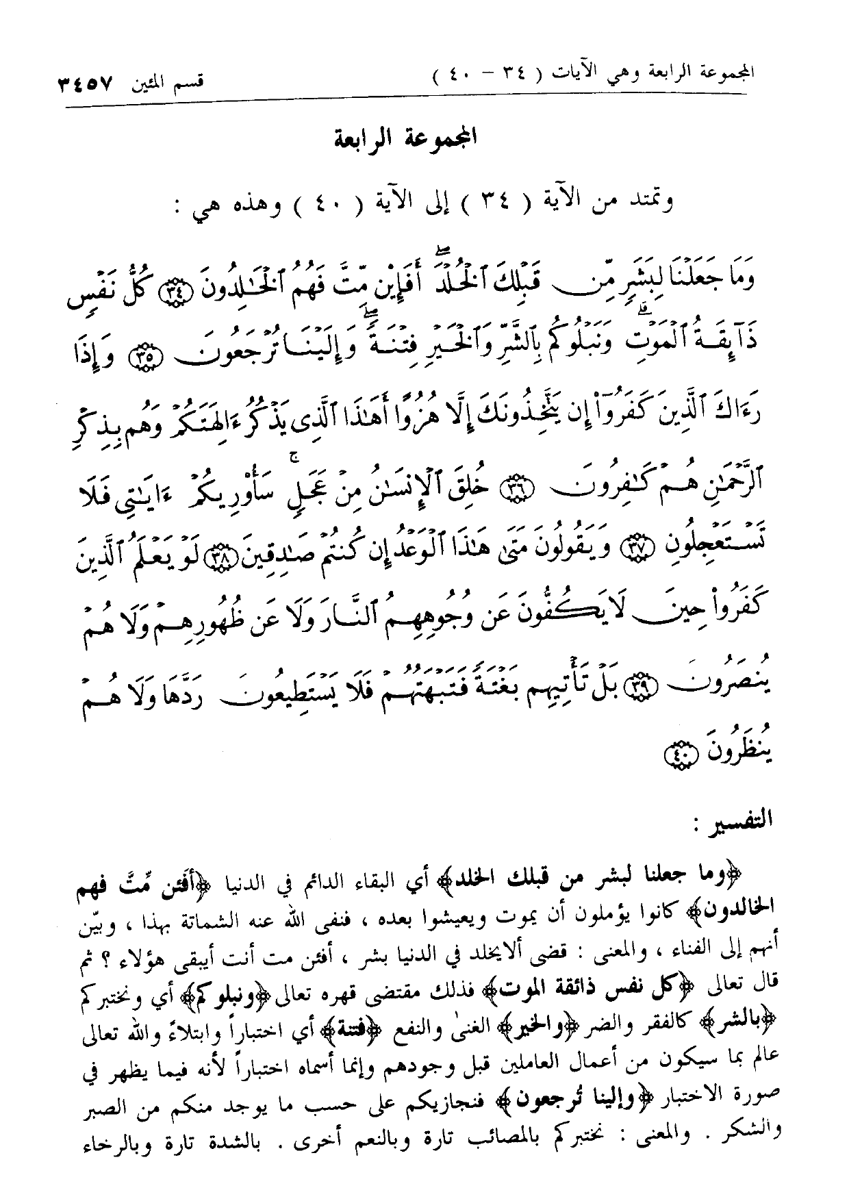 وَما جَعَلْنا لِبَشَرٍ مِنْ قَبْلِكَ الْخُلْدَ أي البقاء الدائم في الدنيا أَفَإِنْ مِتَّ فَهُمُ الْخالِدُونَ كانوا يؤملون أن يموت ويعيشوا بعده، فنفى الله عنه الشماتة بهذا، وبين أنهم إلى الفناء، والمعنى: قضى ألا يخلد في الدنيا بشر، أفإن مت أنت أيبقى هؤلاء؟