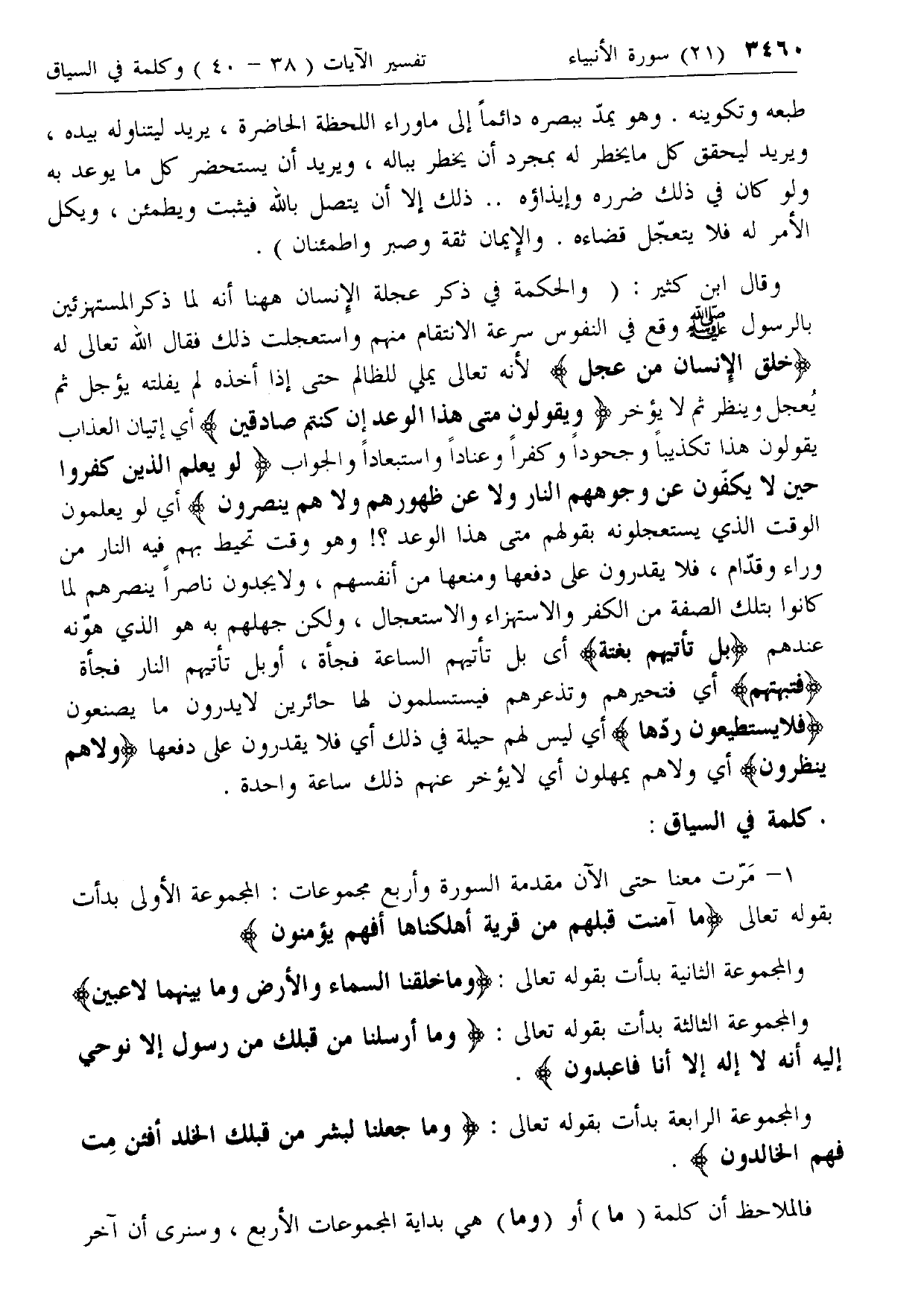 وقال ابن كثير: (والحكمة في ذكر عجلة الإنسان هاهنا أنه لما ذكر المستهزئين بالرسول صلى الله عليه وسلم وقع في النفوس سرعة الانتقام منهم واستعجلت ذلك فقال الله تعالى له خُلِقَ الْإِنْسانُ مِنْ عَجَلٍ لأنه تعالى يملي للظالم حتى إذا أخذه لم يفلته يؤجل ثم يعجل وينظر ثم لا يؤخر
