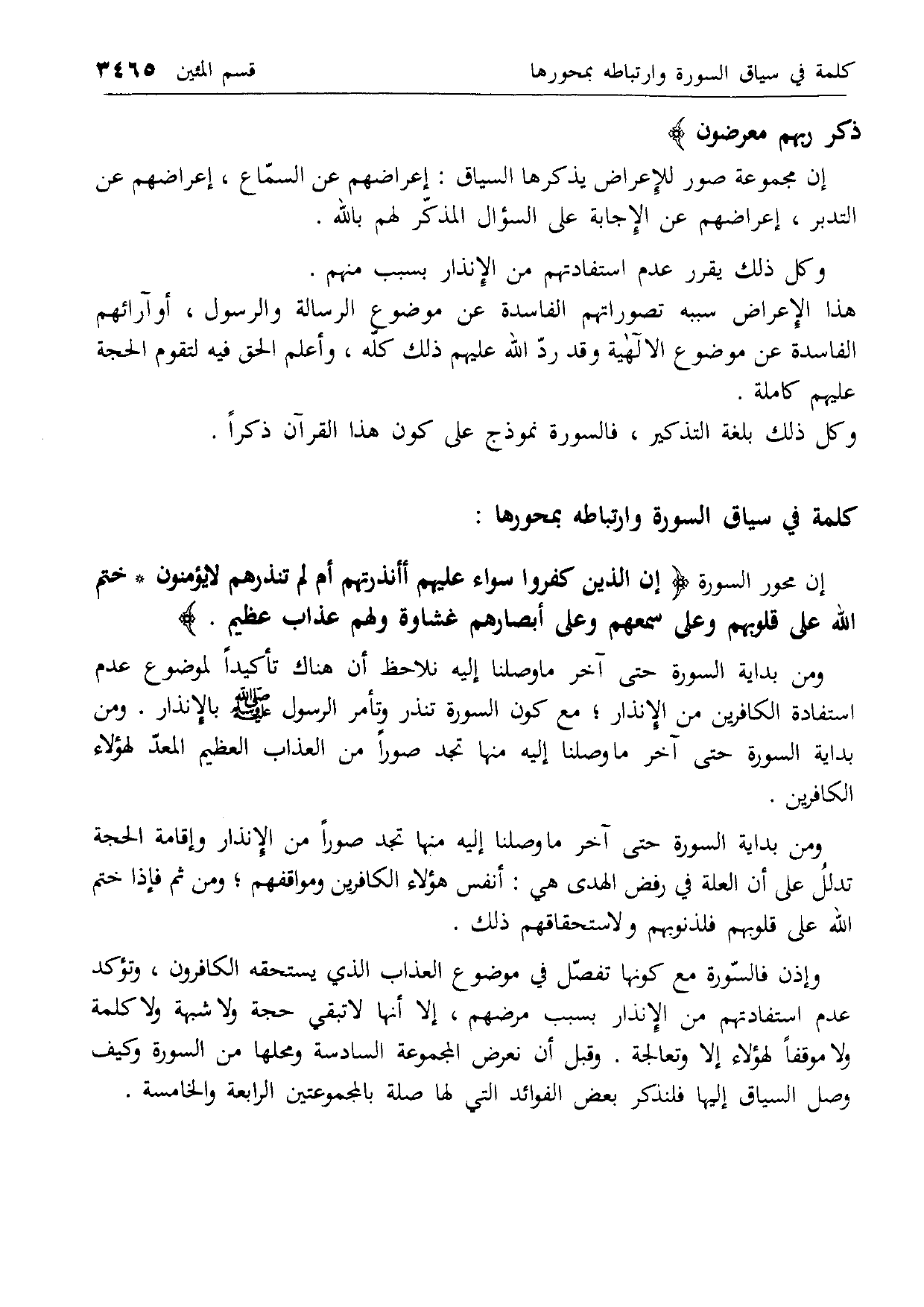 إن محور السورة إِنَّ الَّذِينَ كَفَرُوا سَواءٌ عَلَيْهِمْ أَأَنْذَرْتَهُمْ أَمْ لَمْ تُنْذِرْهُمْ لا يُؤْمِنُونَ* خَتَمَ اللَّهُ عَلى قُلُوبِهِمْ وَعَلى سَمْعِهِمْ وَعَلى أَبْصارِهِمْ غِشاوَةٌ وَلَهُمْ عَذابٌ عَظِيمٌ.