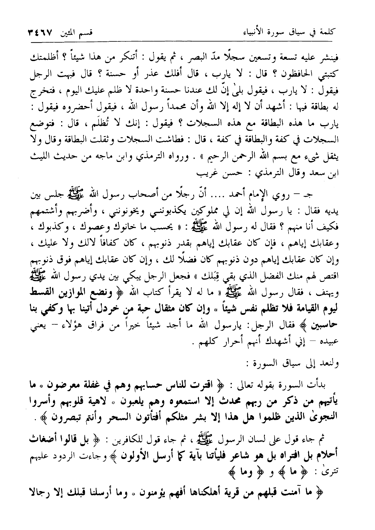 ج- روي الإمام أحمد .... أن رجلا من أصحاب رسول الله صلى الله عليه وسلم جلس بين يديه فقال: يا رسول الله إن لي مملوكين يكذبونني ويخونونني، وأضربهم وأشتمهم فكيف أنا منهم؟ فقال له رسول الله صلى الله عليه وسلم: «يحسب ما خانوك وعصوك، وكذبوك، وعقابك إياهم، فإن كان عقابك إياهم بقدر ذنوبهم، كان كفافا لا لك ولا عليك، وإن كان عقابك إياهم دون ذنوبهم كان فضلا لك، وإن كان عقابك إياهم فوق ذنوبهم اقتص لهم منك الفضل الذي بقي قبلك» فجعل الرجل يبكي بين يدي رسول الله صلى الله عليه وسلم ويهتف، فقال رسول الله صلى الله عليه وسلم «ما له لا يقرأ كتاب الله وَنَضَعُ الْمَوازِينَ الْقِسْطَ لِيَوْمِ الْقِيامَةِ فَلا تُظْلَمُ نَفْسٌ شَيْئاً* وَإِنْ كانَ مِثْقالَ حَبَّةٍ مِنْ خَرْدَلٍ أَتَيْنا بِها وَكَفى بِنا حاسِبِينَ فقال الرجل: يا رسول الله ما أجد شيئا خيرا من فراق هؤلاء- يعني عبيده- إني أشهدك أنهم أحرار كلهم.