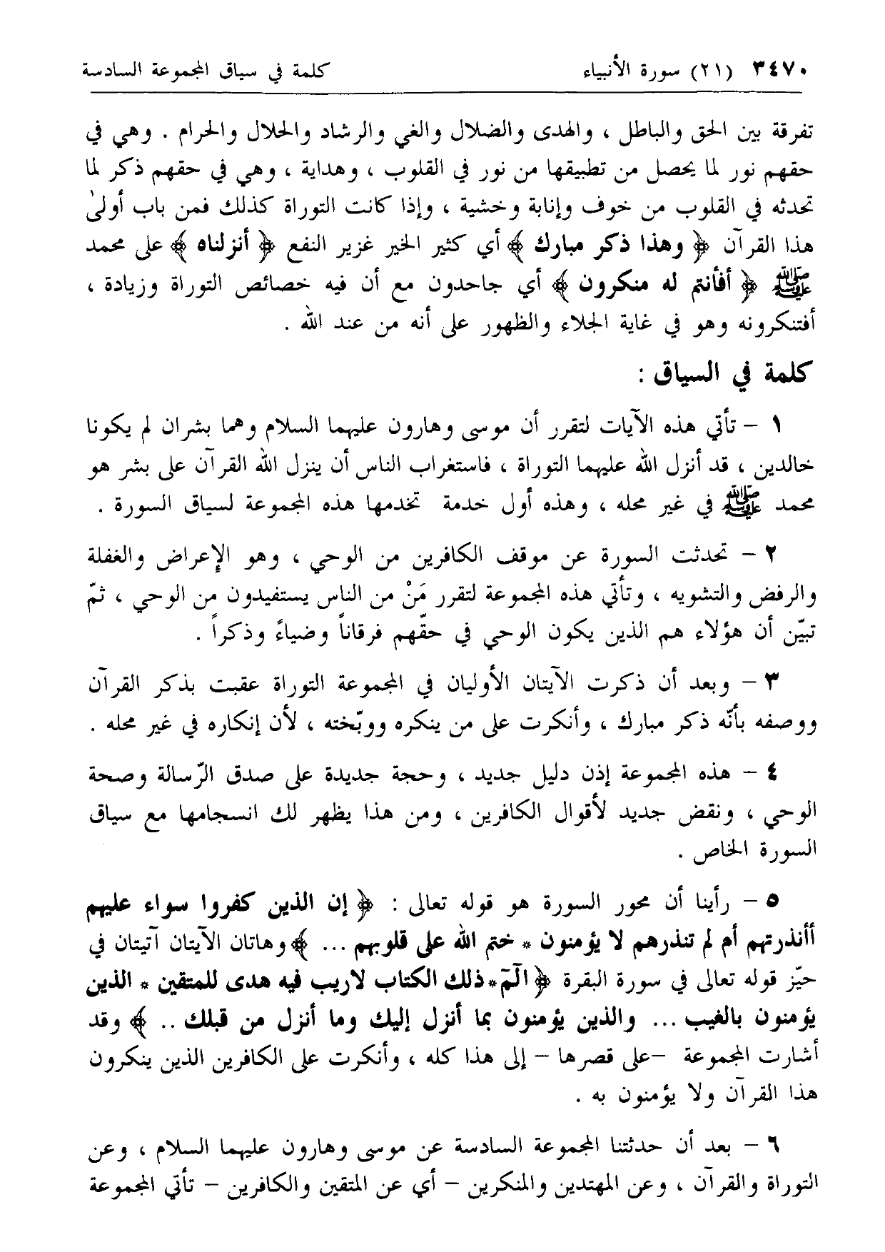 6 - بعد أن حدثتنا المجموعة السادسة عن موسى وهارون عليهما السلام، وعن التوراة والقرآن، وعن المهتدين والمنكرين- أي عن المتقين والكافرين- تأتي المجموعة