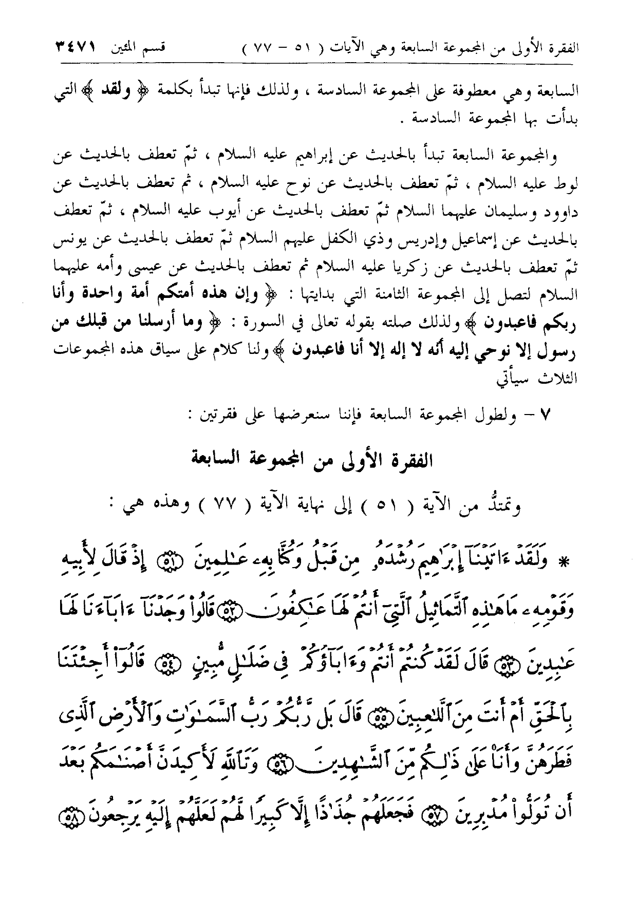 والمجموعة السابعة تبدأ بالحديث عن إبراهيم عليه السلام، ثم تعطف بالحديث عن لوط عليه السلام، ثم تعطف بالحديث عن نوح عليه السلام، ثم تعطف بالحديث عن داود وسليمان عليهما السلام ثم تعطف بالحديث عن أيوب عليه السلام، ثم تعطف بالحديث عن إسماعيل وإدريس وذي الكفل عليهم السلام ثم تعطف بالحديث عن يونس ثم تعطف بالحديث عن زكريا عليه السلام ثم تعطف بالحديث عن عيسى وأمه عليهما السلام لتصل إلى المجموعة الثامنة التي بدايتها: إِنَّ هذِهِ أُمَّتُكُمْ أُمَّةً واحِدَةً وَأَنَا رَبُّكُمْ فَاعْبُدُونِ ولذلك صلته بقوله تعالى في السورة: وَما أَرْسَلْنا مِنْ قَبْلِكَ مِنْ رَسُولٍ إِلَّا نُوحِي إِلَيْهِ أَنَّهُ لا إِلهَ إِلَّا أَنَا فَاعْبُدُونِ ولنا كلام على سياق هذه المجموعات الثلاث سيأتي