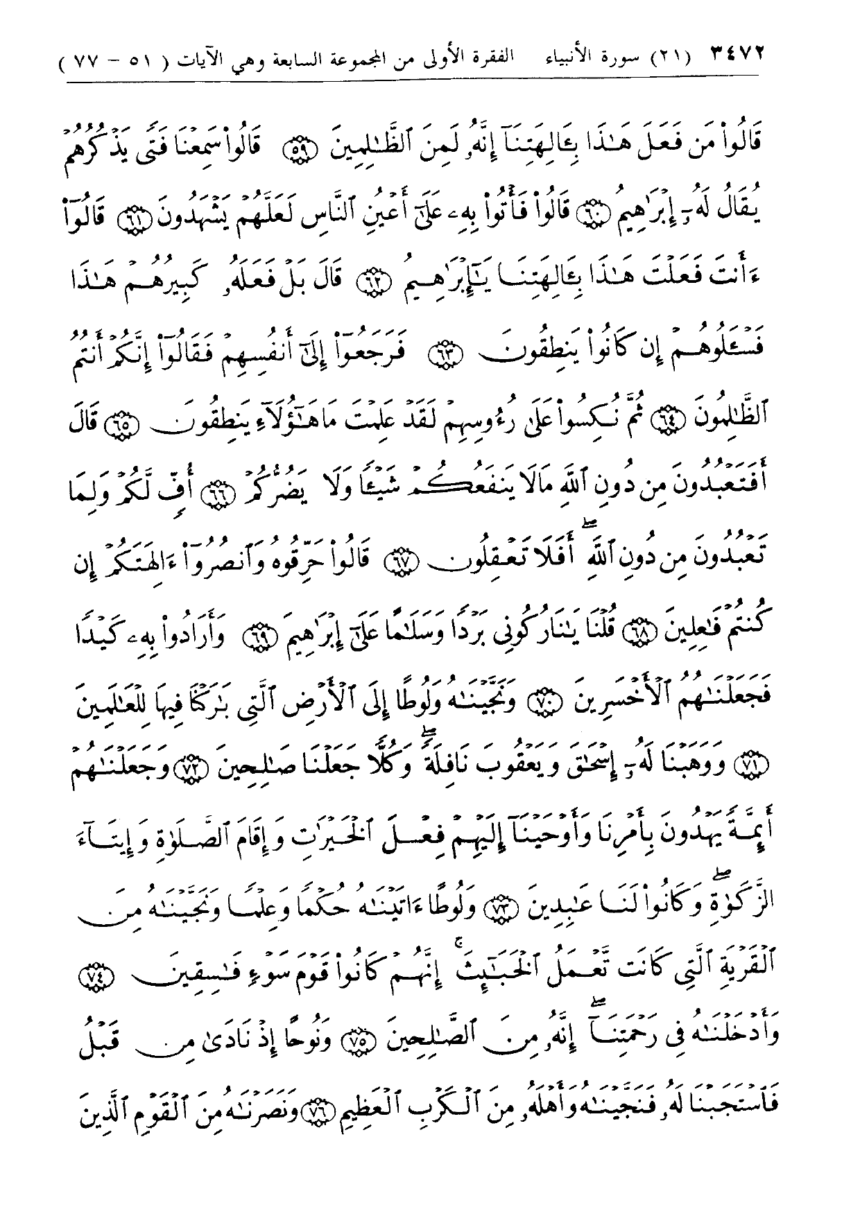 قُلْنا يا نارُ كُونِي بَرْداً وَسَلاماً عَلى إِبْراهِيمَ (69) وَأَرادُوا بِهِ كَيْداً فَجَعَلْناهُمُ الْأَخْسَرِينَ (70) وَنَجَّيْناهُ وَلُوطاً إِلَى الْأَرْضِ الَّتِي بارَكْنا فِيها لِلْعالَمِينَ (71) وَوَهَبْنا لَهُ إِسْحاقَ وَيَعْقُوبَ نافِلَةً وَكُلاًّ جَعَلْنا صالِحِينَ (72) وَجَعَلْناهُمْ أَئِمَّةً يَهْدُونَ بِأَمْرِنا وَأَوْحَيْنا إِلَيْهِمْ فِعْلَ الْخَيْراتِ وَإِقامَ الصَّلاةِ وَإِيتاءَ الزَّكاةِ وَكانُوا لَنا عابِدِينَ (73)