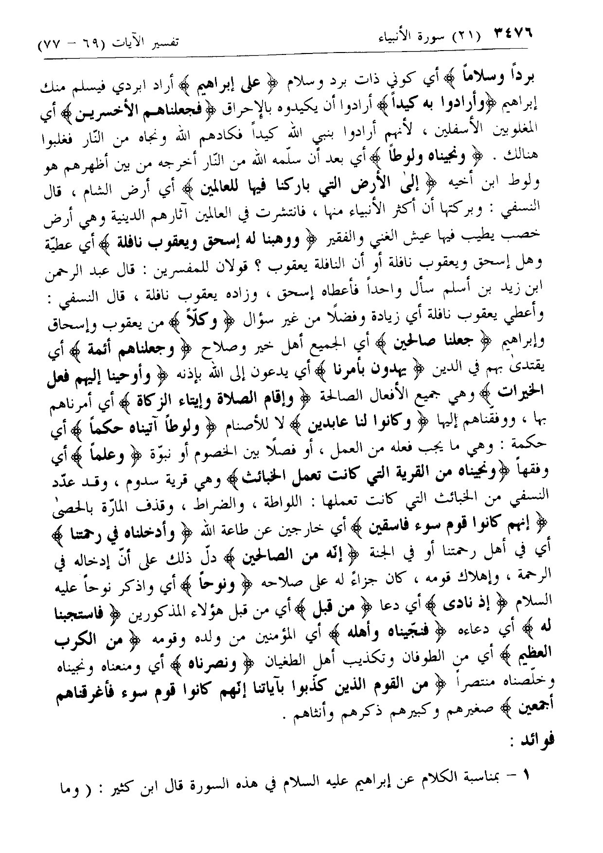 وَلُوطاً آتَيْناهُ حُكْماً أي حكمة: وهي ما يجب فعله من العمل، أو فصلا بين الخصوم أو نبوة وَعِلْماً أي وفقها وَنَجَّيْناهُ مِنَ الْقَرْيَةِ الَّتِي كانَتْ تَعْمَلُ الْخَبائِثَ وهي قرية سدوم، وقد عدد النسفي من الخبائث التي كانت تعملها: اللواطة، والضراط، وقذف المارة بالحصى إِنَّهُمْ كانُوا قَوْمَ سَوْءٍ فاسِقِينَ أي خارجين عن طاعة الله